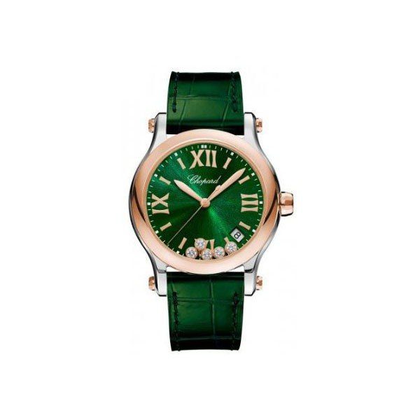 36mm stainless steel & 18kt rose gold case, scratch resistant sapphire crystal, fixed bezel, green dial, quartz movement, green leather strap, water resistant to 30m/100ft.