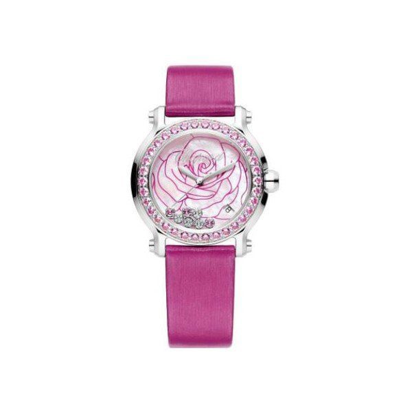 36 mm stainless steel case, pink mother of pearl dial, fixed bezel, scratch resistant sapphire crystal, solid case back, fuchsia satin strap, quartz movement, tang buckle clasp, water resistant to 30m/100ft.