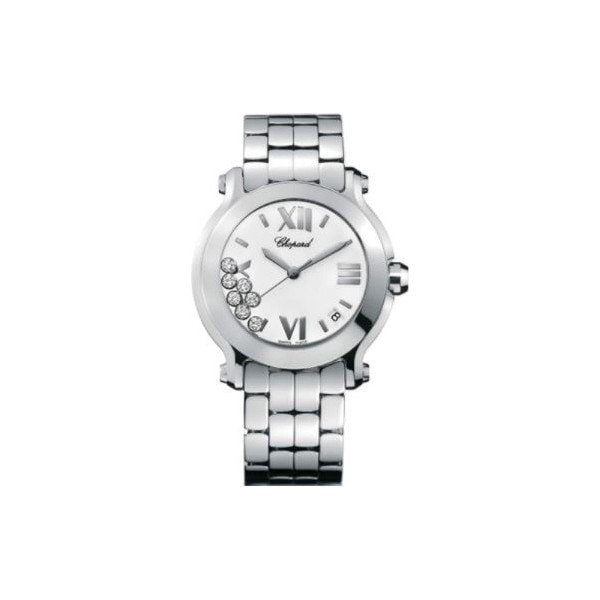 Medium size (36 mm) stainless steel case 7 moving diamonds, black dial, quartz movement with date at 4 o’clock, stainless steel bracelet. Water resistant to 30 meters.