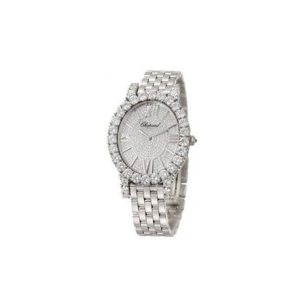 40 mm 18kt white gold case, quartz movement, scratch resistant sapphire crystal.
