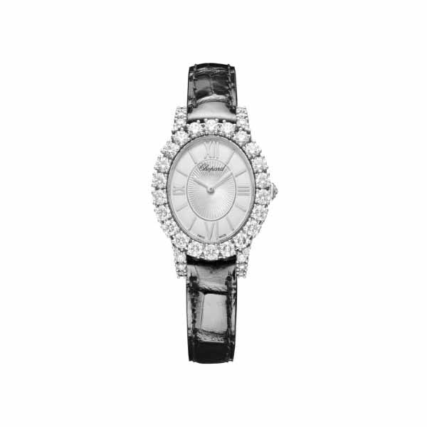29.4 x 34.2 mm white gold material, mother of pearl dial, black leather strap, quartz movement.
