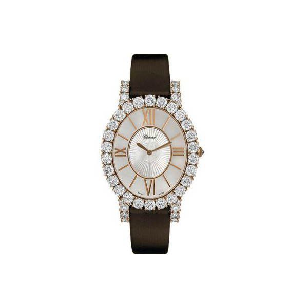 34.1mm x 40mm 18k rose gold case, diamond bezel, scratch resistant sapphire crystal, quartz movement, silver dial, brown leather strap, pin clasp, water resistant to 30m/100ft.