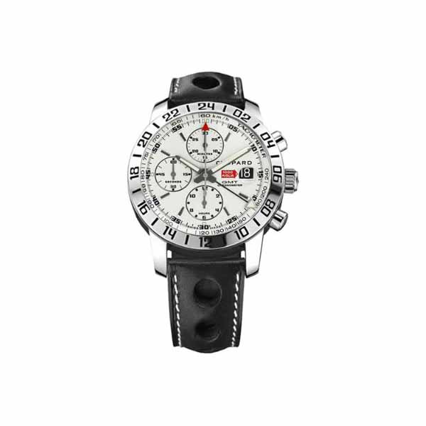 42mm stainless steel case, 14.2mm thickness, white dial, fixed bezel, scratch resistant sapphire crystal, deployment buckle clasp, black leather strap, automatic movement, transparent case back, water resistant to 50m/165ft.
