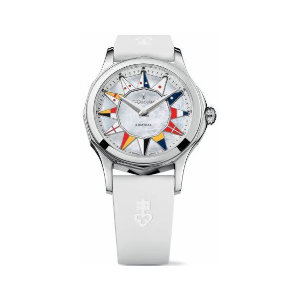 32 mm stainless steel case, 8.90 mm thick, sapphire back, white mother-of-pearl dial with transferred nautical flags in color, caliber CO 400 automatic movement with hours, minutes, approximately 40 hour of power reserve, white vulcanized rubber strap, pin buckle. Water resistant to 50 meters / 5 ATM.