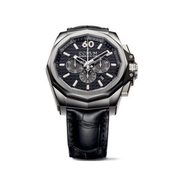 45 mm titanium case, black dial, power reserve 42 h, screw down crown, deployment clasp, automatic movement, black leather strap, transparent case back, fixed bezel.