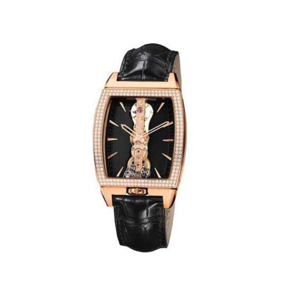 34 mm x 51 mm 18kt rose gold case, transparent case back, fixed bezel, black dial, scratch resistant sapphire crystal, power reserve 40 h, folding clasp, black leather strap, water resistant to 30m/100ft.