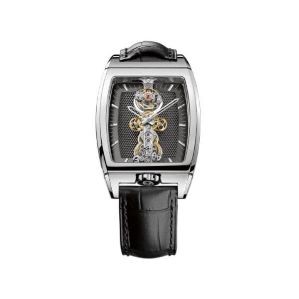 34 x 51mm 18K white gold case, 10.90mm thick, transparent back with key-shaped glare proof sapphire crystal, 18K white gold bezel, sapphire crystal crystal with anti-reflective treatment, black dial, caliber co 213 hand-wound movement with hours, minutes, tourbillon, approximately 40 hours of power reserve, black leather strap, tongue buckle buckle. Water resistant to 3 atm.