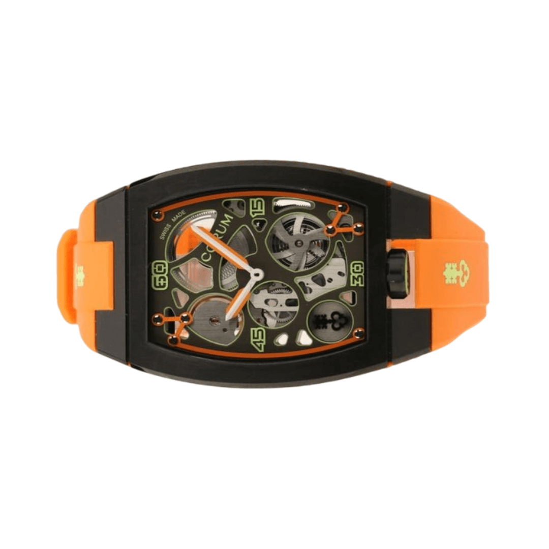 The transparent dial showcases the inner workings of the watch, adding a sophisticated touch. The outer rim is colored in gray and vibrant orange, making it stand out. The fixed bezel, also made from Titanium Grade 5 with Black DLC Coating, enhances the watch’s rugged appeal.