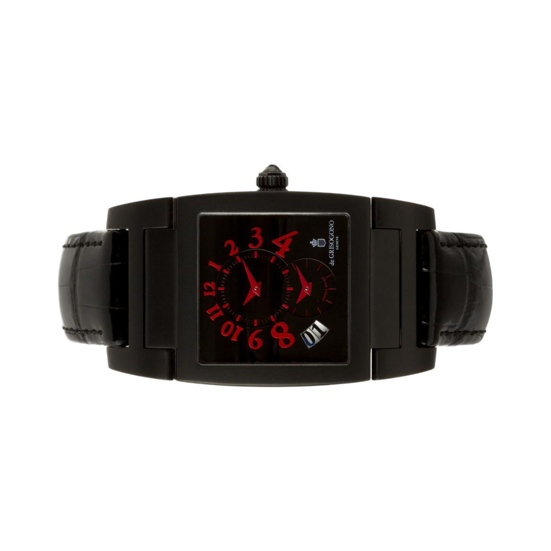 The black dial is complemented by bold red Arabic numerals, creating a striking contrast. It includes a GMT function at 6 o’clock, allowing the wearer to track dual time zones, and a date display positioned at 7 o’clock for convenience. A small seconds function further enhances its readability.