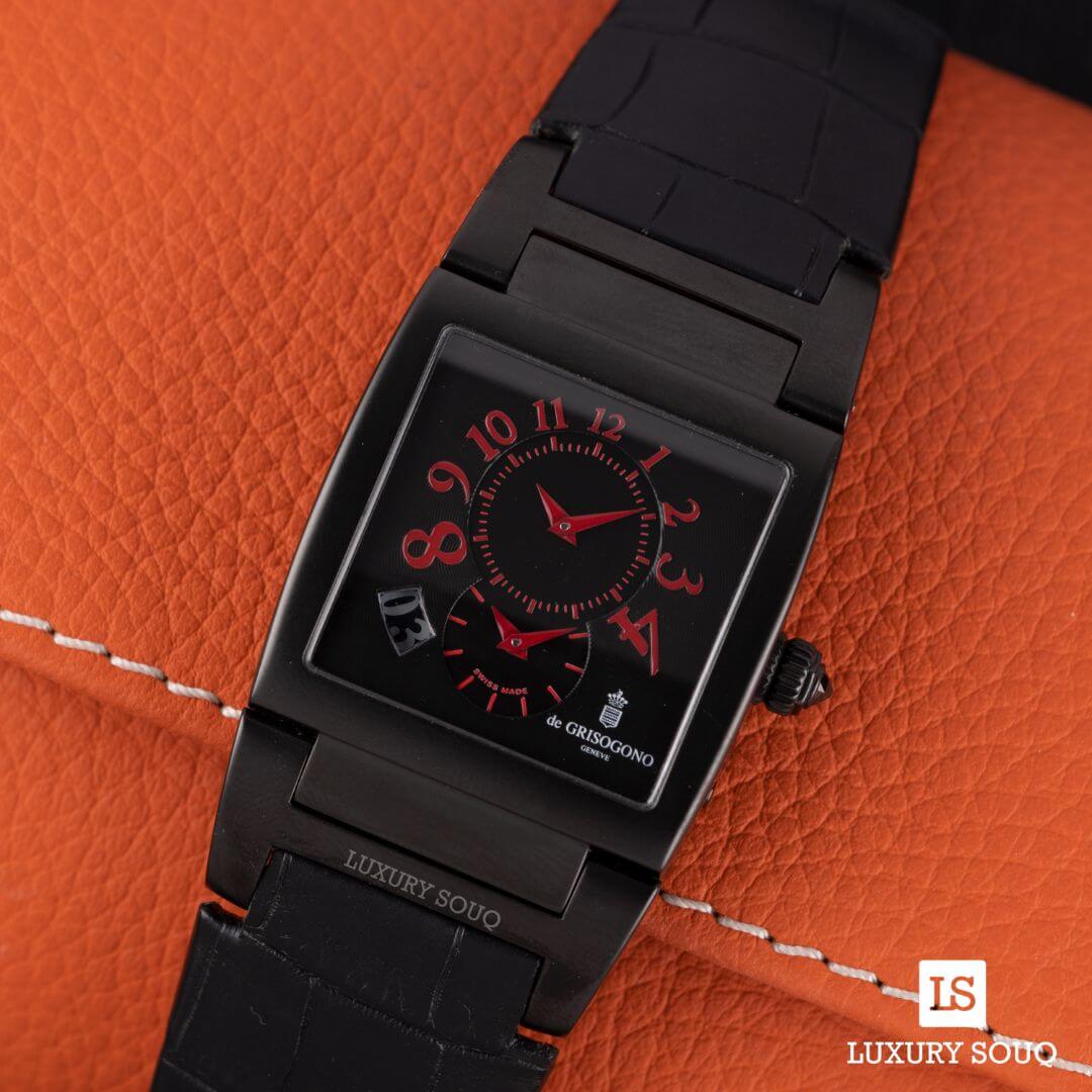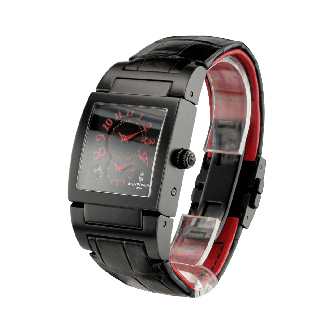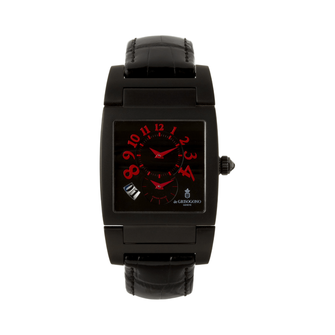 The De Grisogono Instrument One DF N31 is a luxury unisex watch that blends elegance with high-end craftsmanship. It features a matte blackened steel case with a unique 37.5 x 56.6 mm rectangular shape, making it stand out. The watch is paired with a black alligator leather strap and a double-ply PVD-treated steel folding clasp for a secure and comfortable fit.