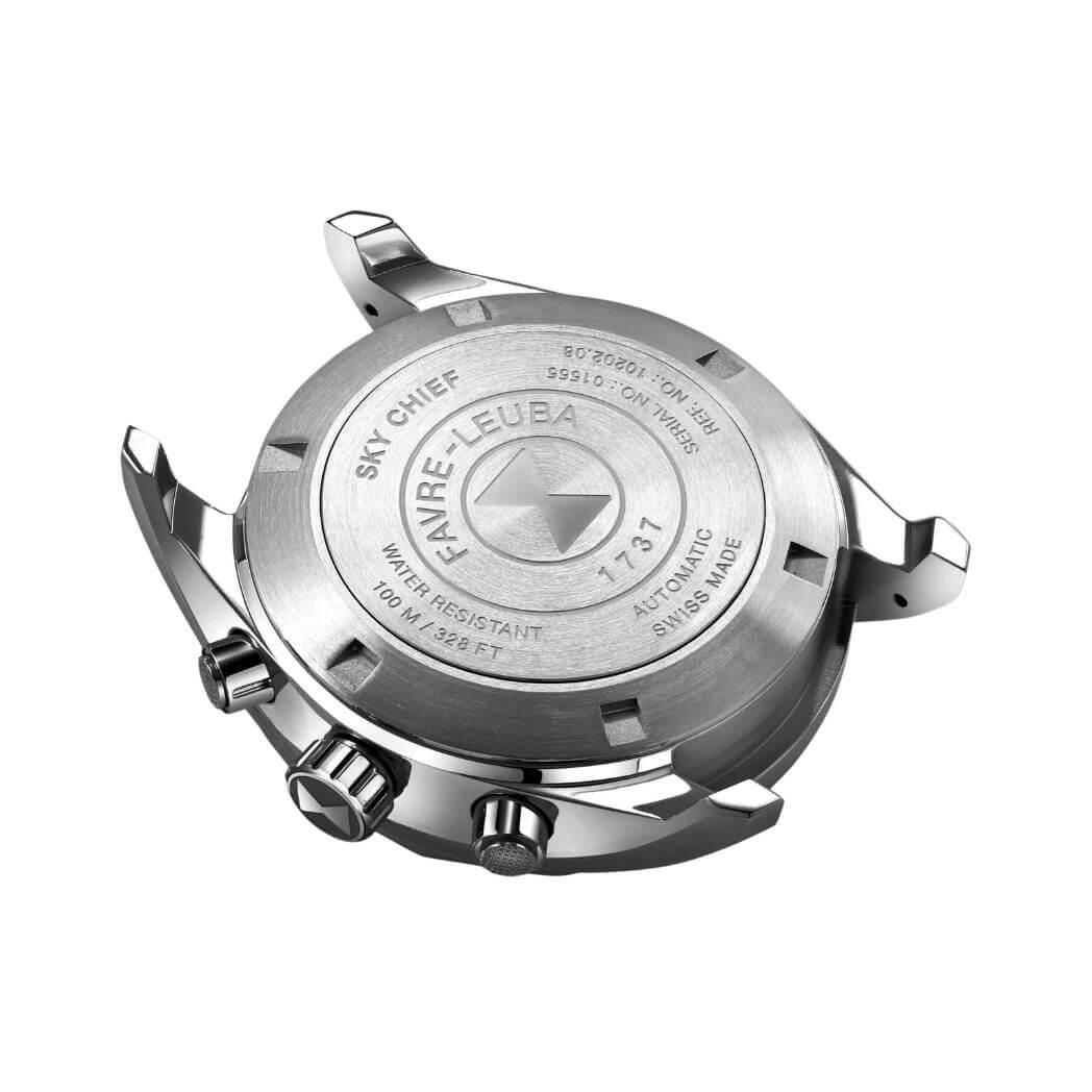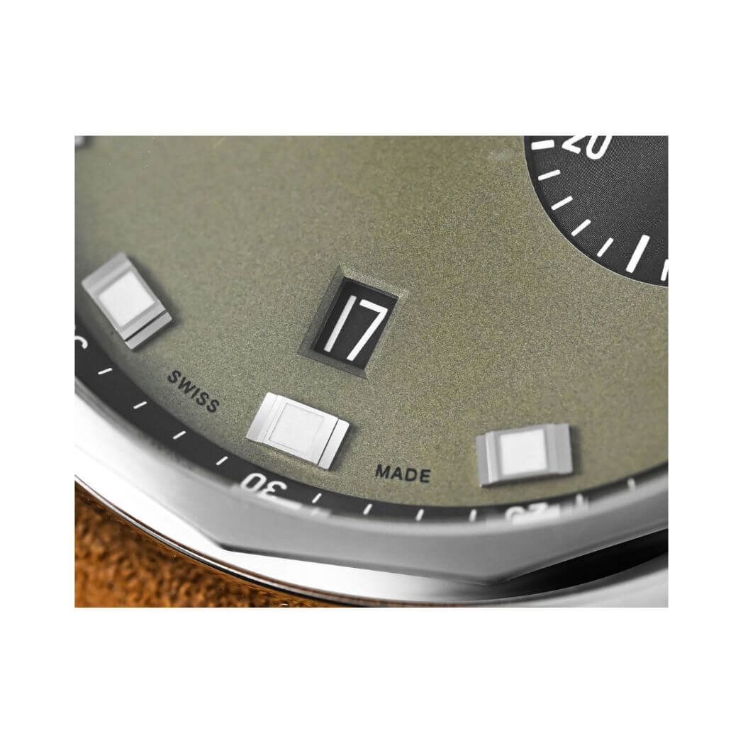 The Chief Chronograph boasts a 43mm round case, offering a confident, minimalist appeal. The chequered motif on the chronograph pushers and the signature bridge-shaped form add vivid character, while the screwed caseback ensures water resistance up to 100 meters.