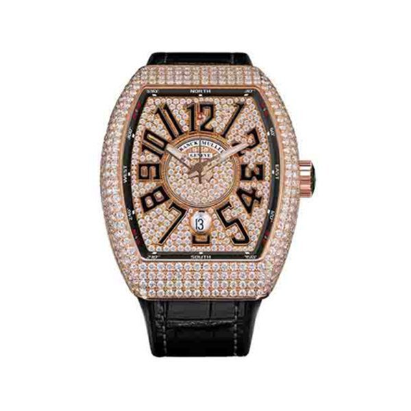 Franck Muller Vanguard V 45 Sc Dt D Cd 5N Nr Diamond Fave 53.7Mm Automatic Rose Gold Black Leather Strap Men’S Watch