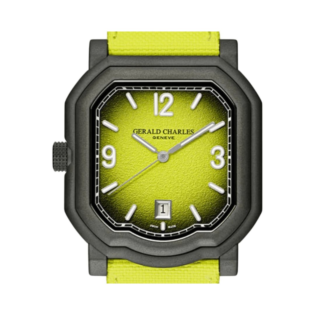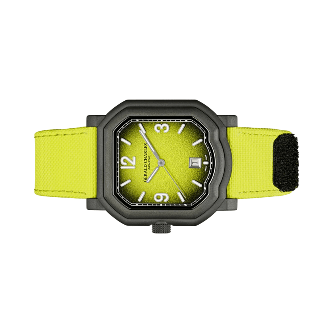 The Gerald Charles Maestro GC Sport Tennis GC2.0-TX-TNSB-24GR-RSVC is a luxury men’s watch made for performance and comfort. It features a unique Darkblast® titanium case that is strong, lightweight, and shaped with smooth edges using CNC technology. The grainy-textured yellow dial is inspired by the look and feel of modern tennis, adding a sporty and fresh style to the timepiece.
