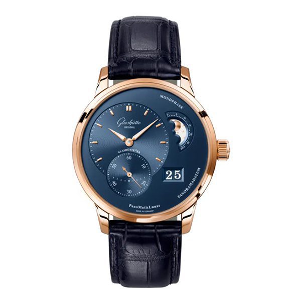 The signature feature of the Pano Collection is the asymmetric dial layout, which is based on the golden ratio. The axes of all hands are aligned vertically in the left half of the dial, while the Panorama Date and splendid moon phase display define the right half.