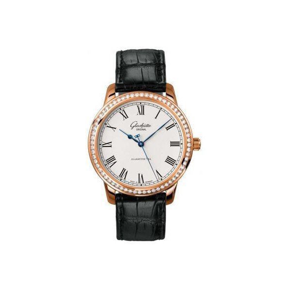 40 mm 18kt rose gold case, 9.9 mm thickness, off white dial, fixed bezel, scratch resistant sapphire crystal, black leather strap, tang buckle clasp, automatic movement, transparent case back, water resistant to 50m/150ft.