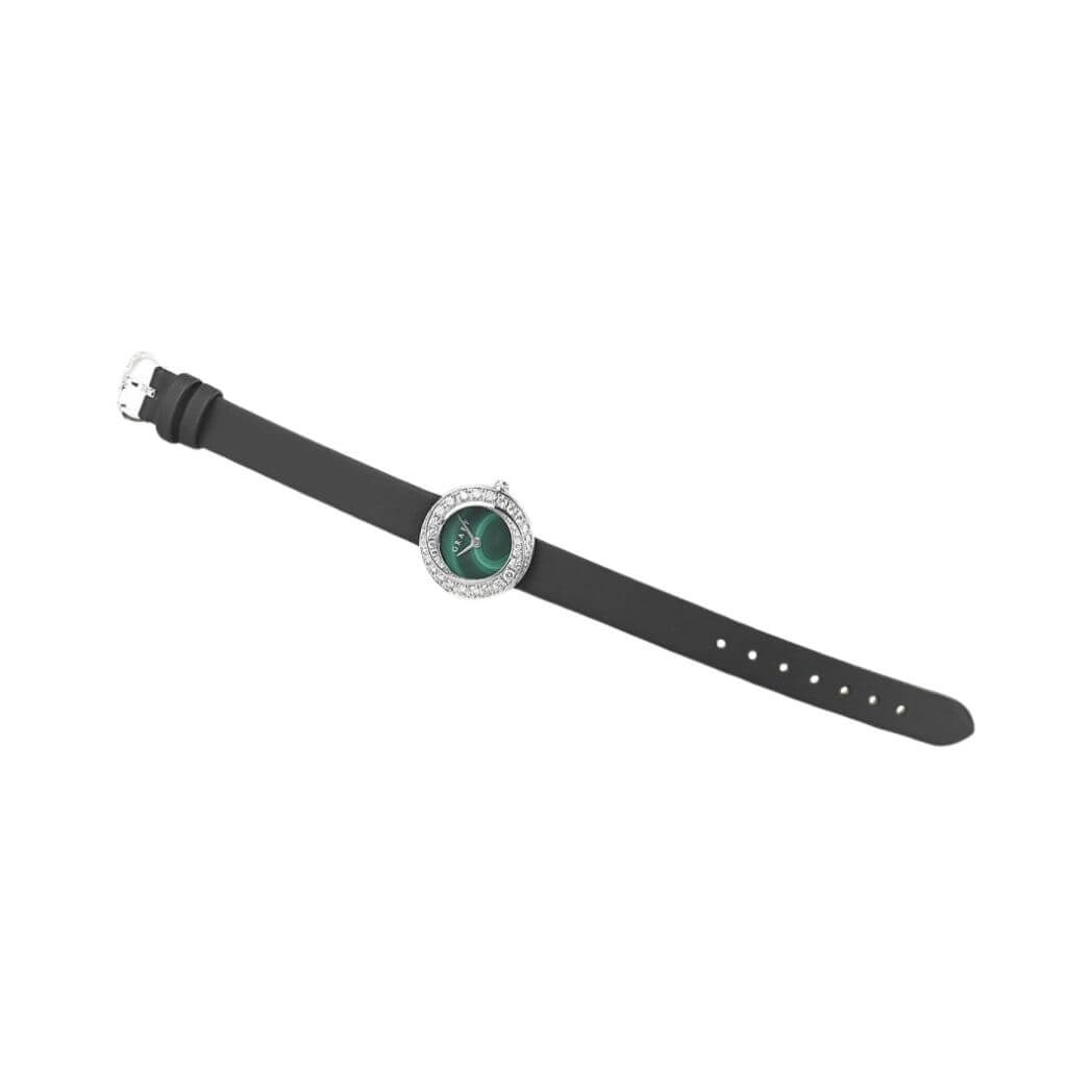 The 23mm case is adorned with a pavé diamond bezel, totaling 2.18 carats, adding a touch of glamour. The circular dial is a captivating focal point, harmonizing with the satin strap that complements the natural hues of the malachite face.