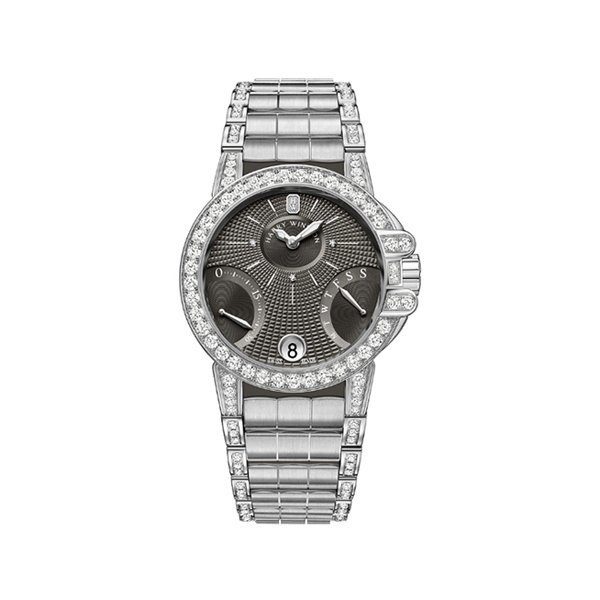 36mm 18k white gold material. Slate grey guilloche textured main dial & flat slate grey sub-dials. 18k white gold bracelet with brushed & polished finishes, grey rubber end links & alternating center links, and outer links set with 3 diamonds per link running down the length of the bracelet. Scratch Resistant Sapphire crystal. Tang buckle clasp, automatic movement. 100m/330ft water resistance.