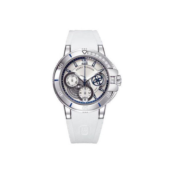 38 mm Zalium case, diamond set rotating bezel, silver-colored spira-shaped engraved dial with sunray satin brushed central finish, off-centered rhodium-colored ring with C?tes de Geneve finishing, set with 1 brilliant-?cut diamond, snailed silver-colored finishes on hours and minutes subdials, blue indexes set with 15 brilliant-cut diamonds, Superluminova at 12 oclock, on hands, and on the shuriken, automatic chronograph movement with date display at 6 o’clock, approximately 42 hours of power reserve, white rubber strap.