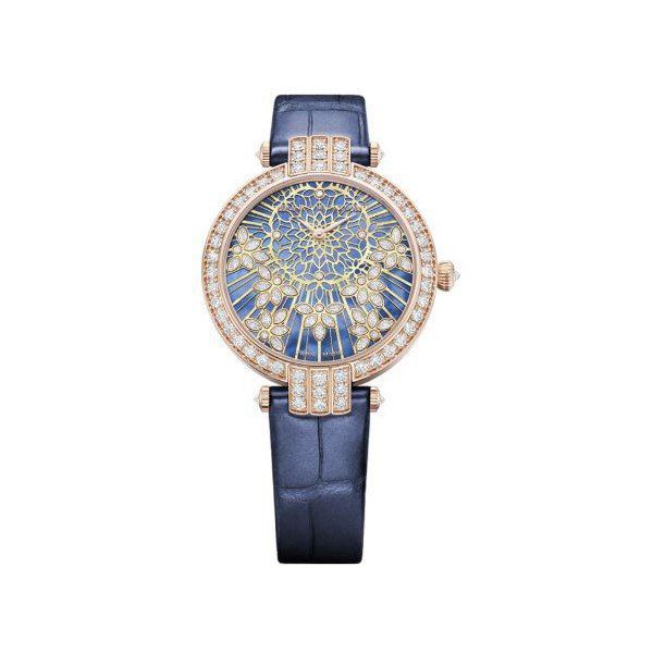36mm 18kt rose gold case, fixed bezel, blue MOP dial featuring 35 marquise-cut Diamonds and 11 brilliant-cut Diamonds, scratch resistant sapphire crystal, Blue pearl leather strap with 18K Rose Gold pin buckle, water resistant to 30m/100ft.