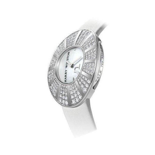 40 mm x 33 mm 18KT white gold case set with 344 brilliant-cut diamonds (3.1 carats), mother of pearl 5th dial with set with one diamond, quartz movement, satin strap.
