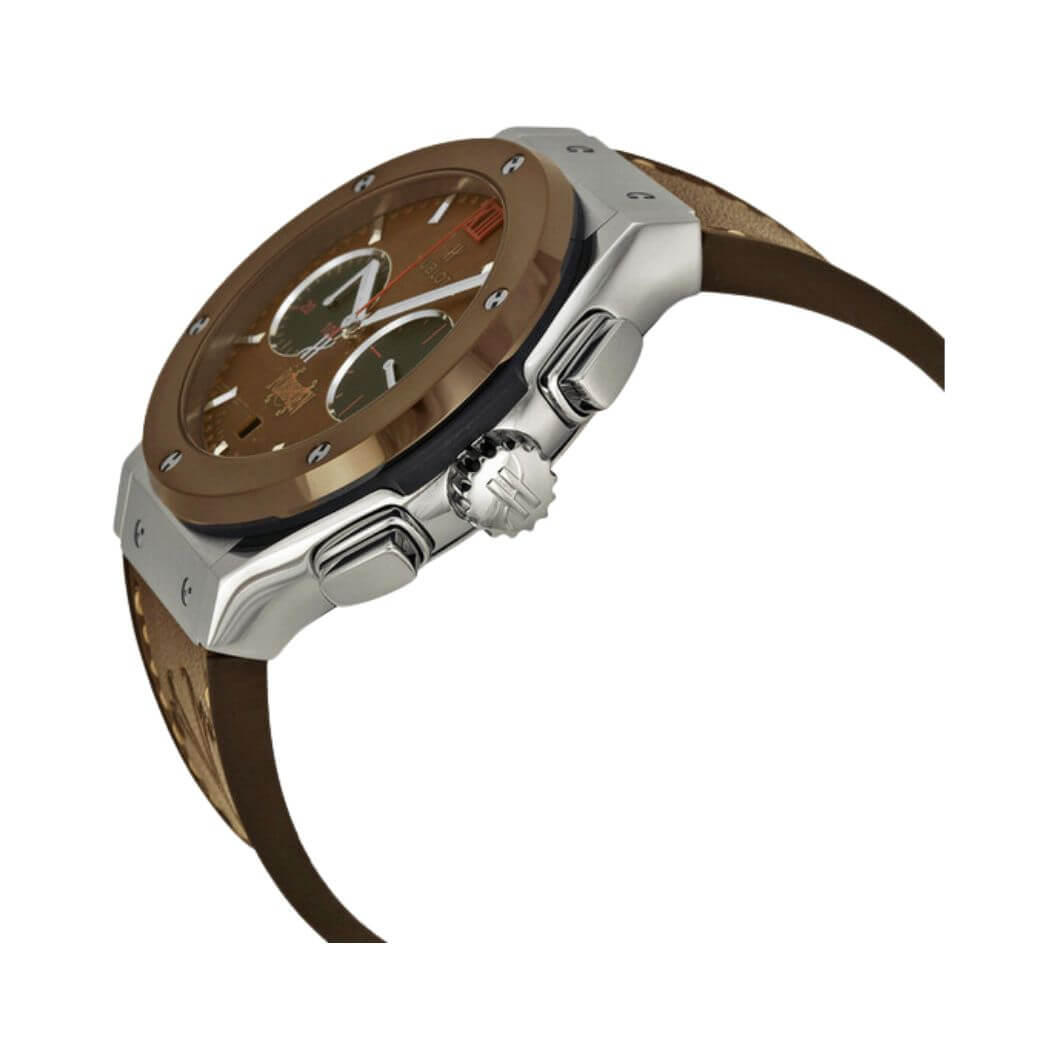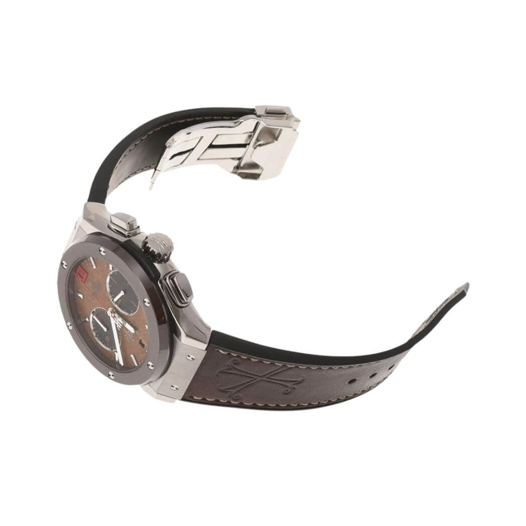 Crafted with precision, the watch features a titanium case paired with a handsome brown leather strap. The fixed brown ceramic bezel complements the overall design, adding a touch of modernity. The genuine tobacco leaf dial hosts silver-tone hands and index hour markers, creating a visually stunning contrast.