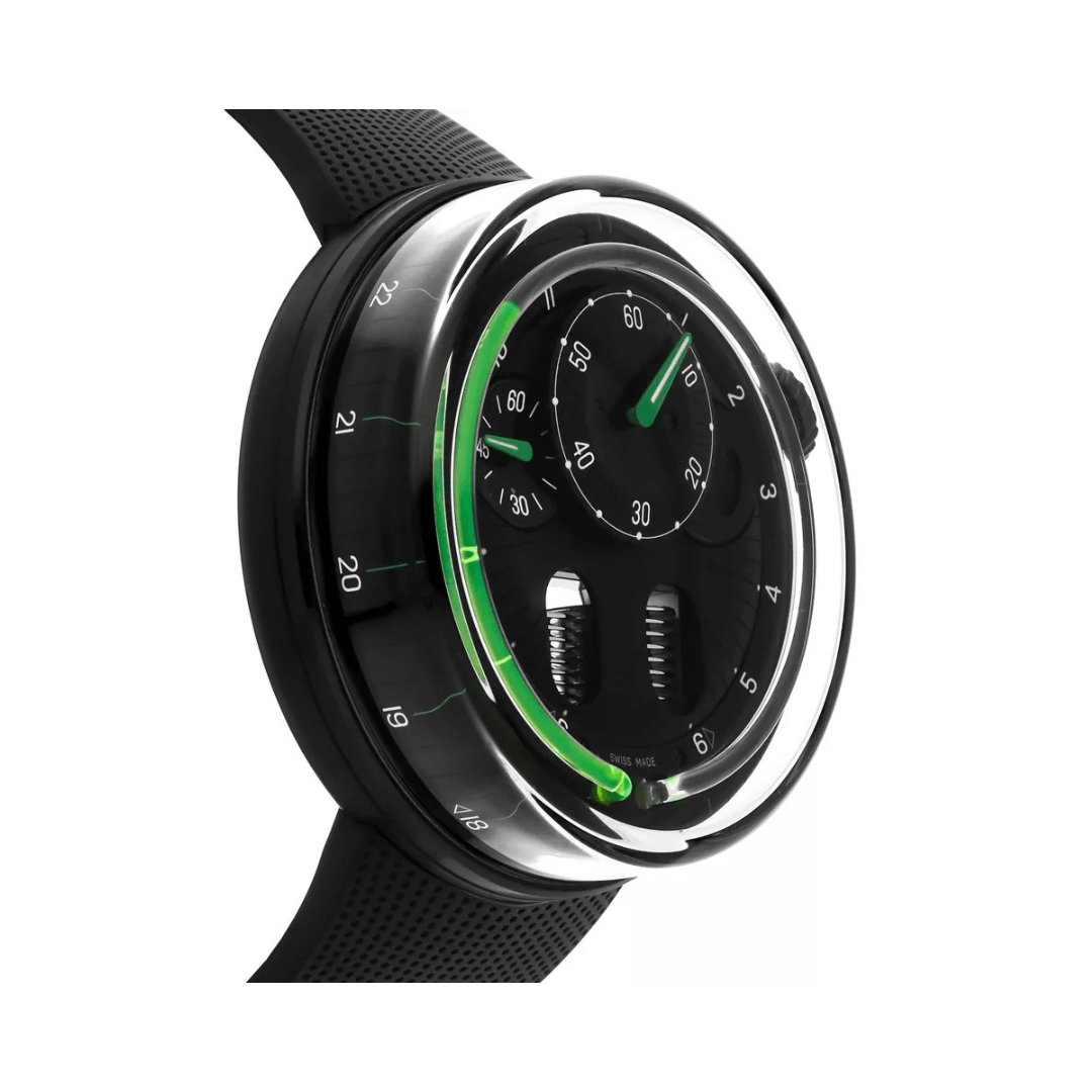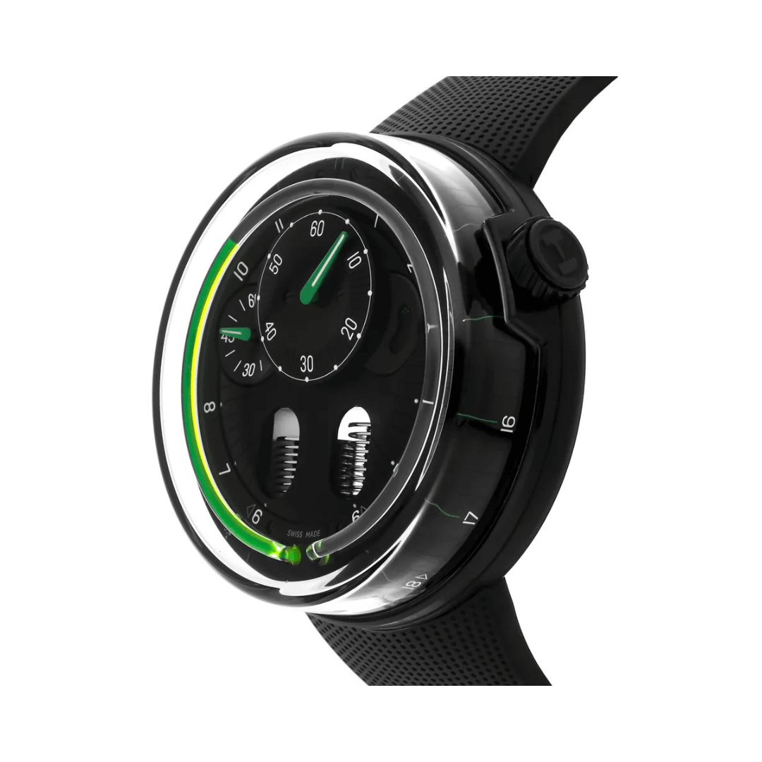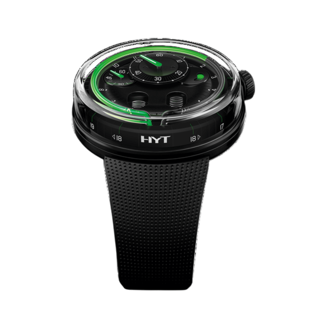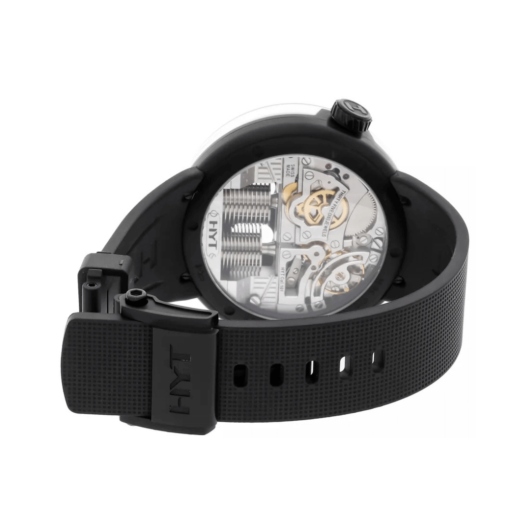 The HYT H0 comes with a durable black rubber strap that offers comfort for everyday wear. Its deployant buckle ensures a secure and easy fit, adding to the convenience and elegance of the watch.