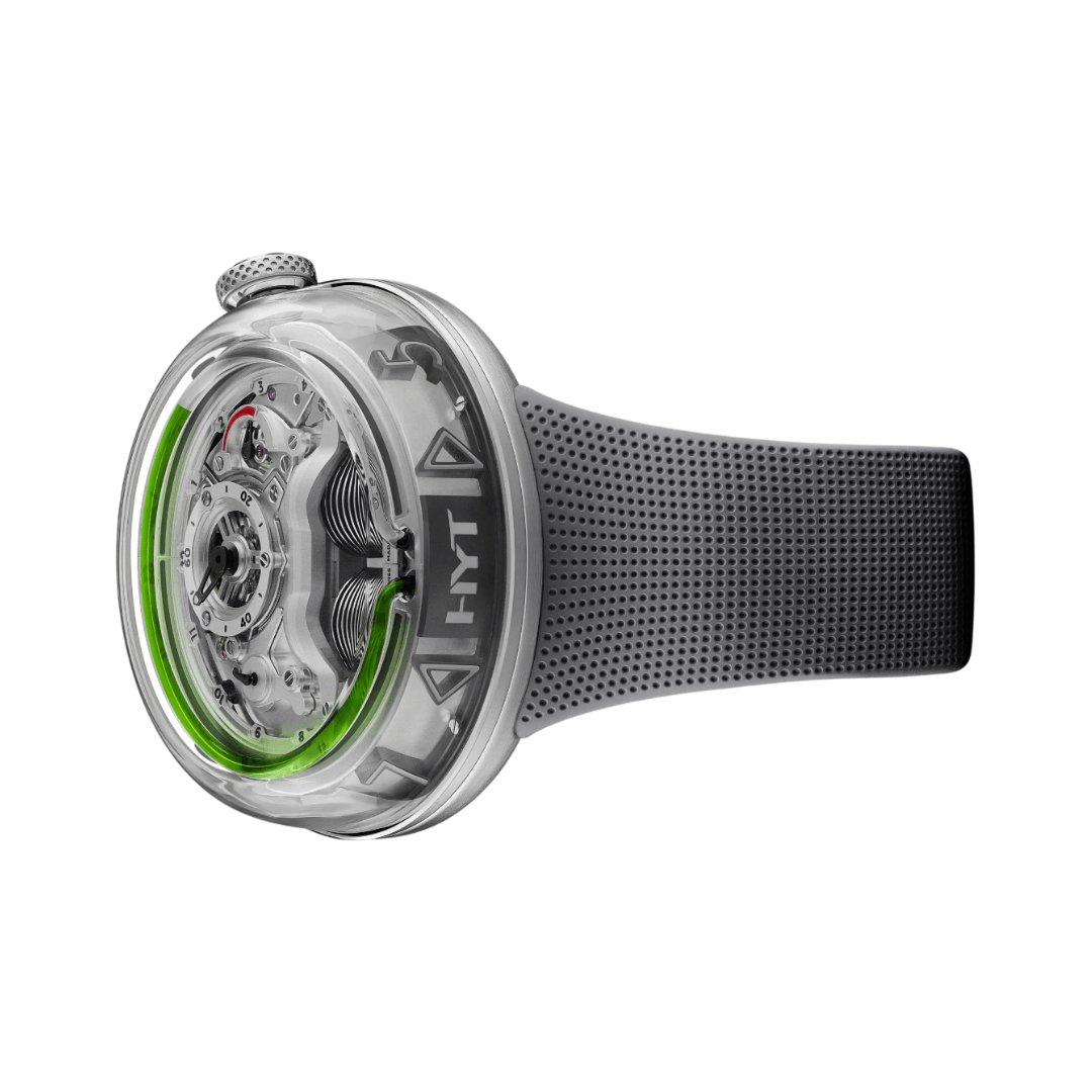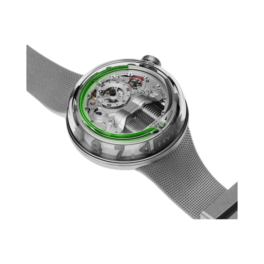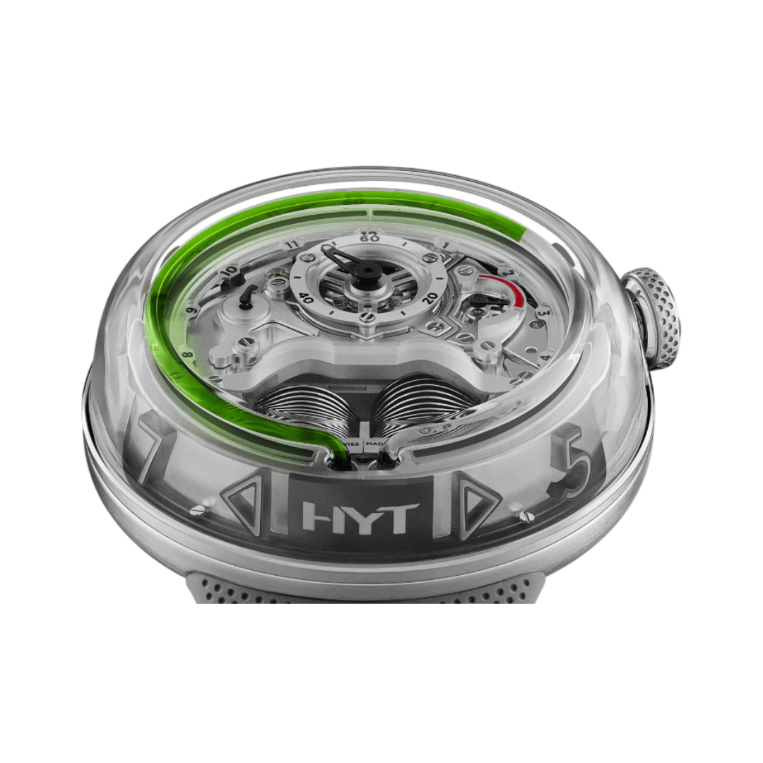 The highlight of this watch is its innovative liquid time indication, a signature feature of HYT. The green fluid display blends perfectly with the silver dial, creating a mesmerizing effect that showcases the brand’s mastery of timekeeping technology.