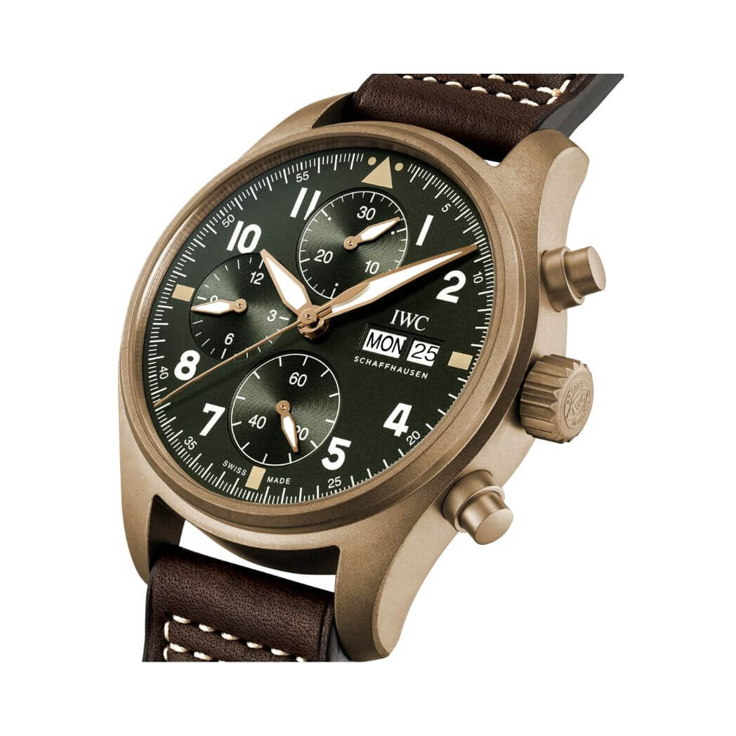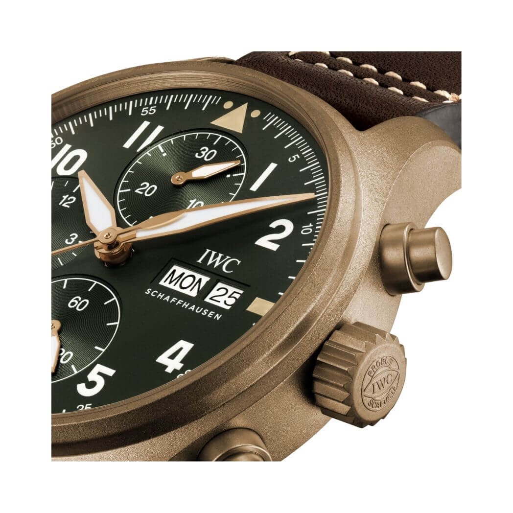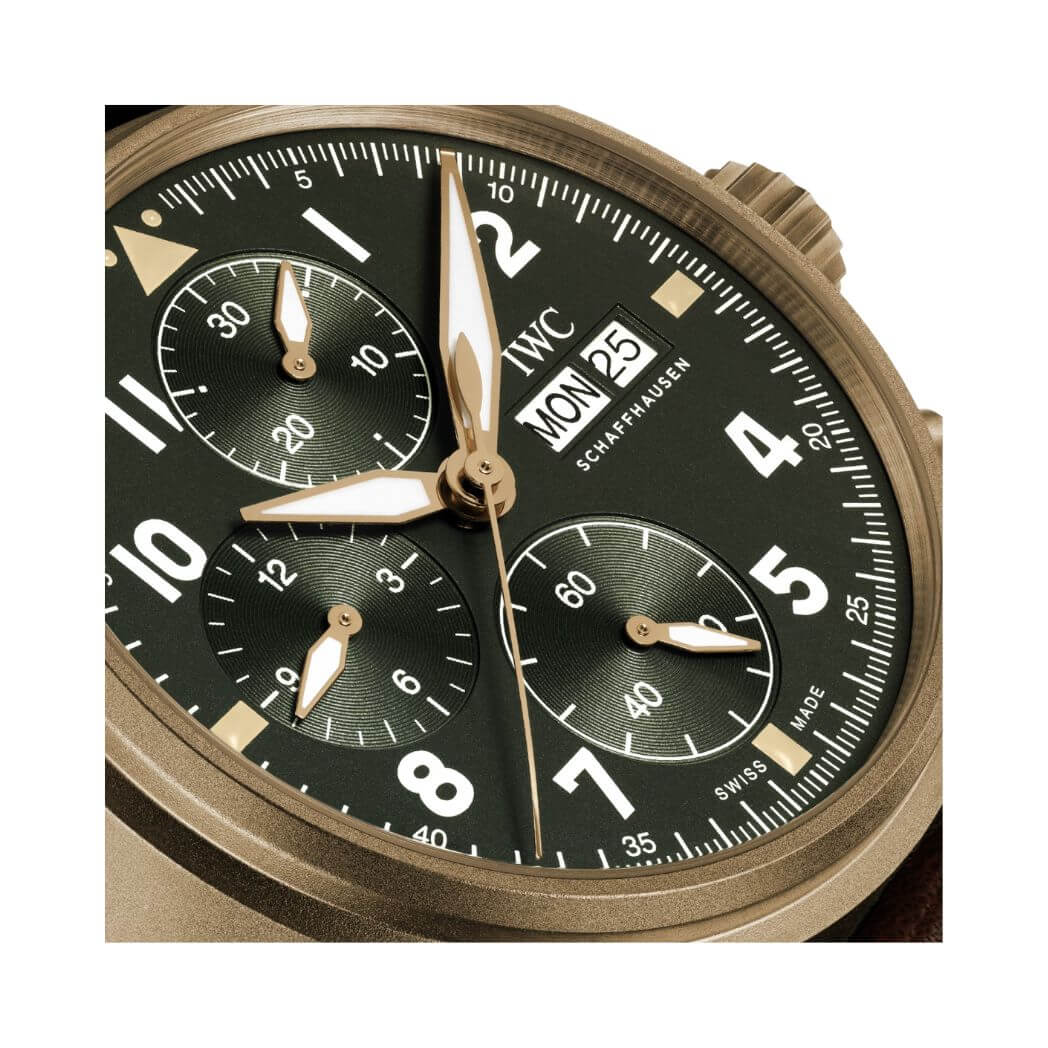 This IWC Pilot watch boasts a 41mm bronze case, giving it a distinctive and elegant appearance. The green dial, coupled with scratch-resistant sapphire crystal, not only enhances readability but also ensures enduring durability.