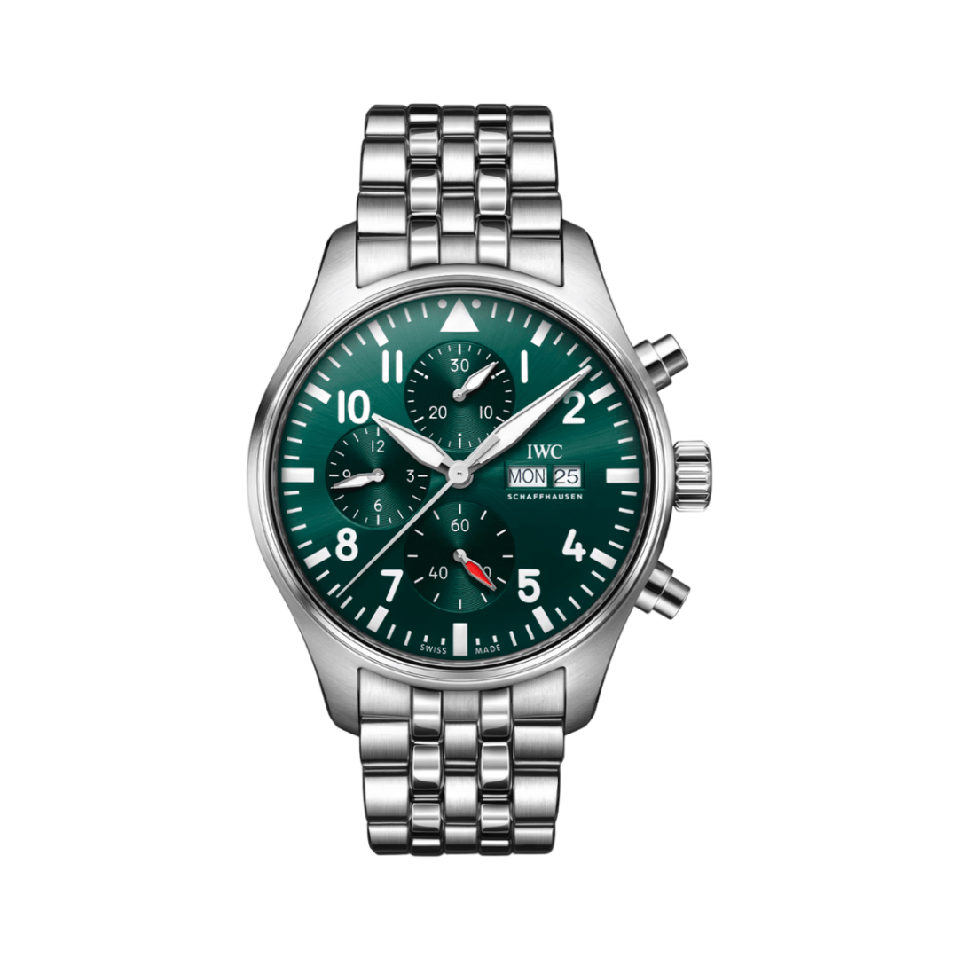 Inspired by cockpit instruments, the racing green dial enhances readability. It includes Arabic numerals and baton markers, along with chronograph functions that measure time to the nearest hour, minute, and second. A day and date display adds extra convenience for daily wear.