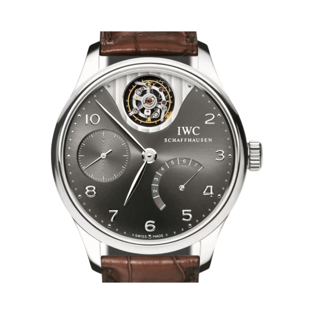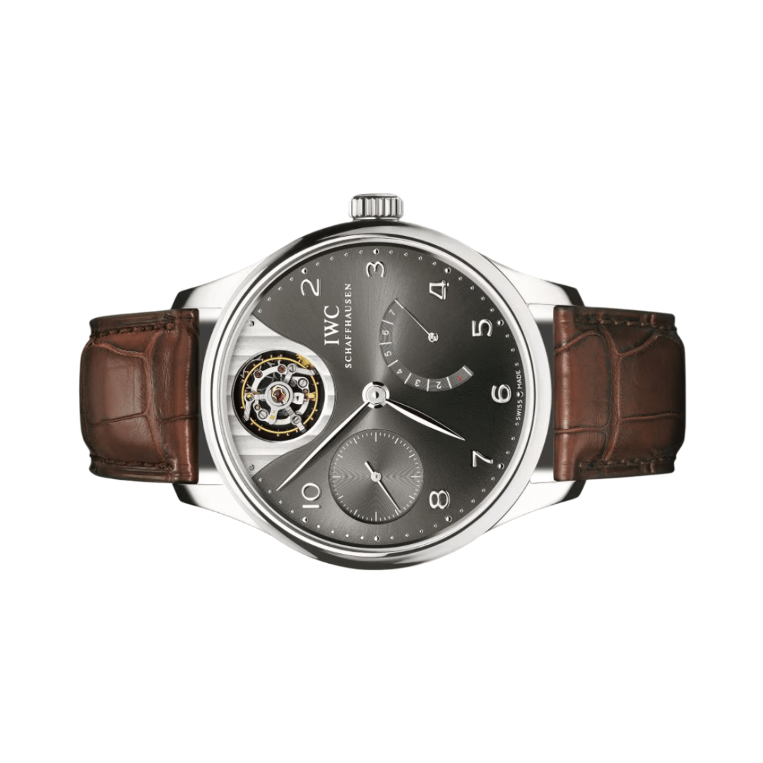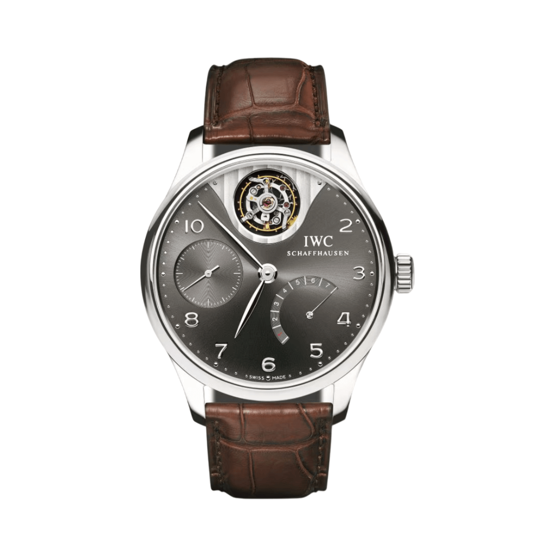 The IWC Portuguese Tourbillon Mystere IW504207 is a luxury timepiece designed for men who appreciate fine craftsmanship. The watch features an 18kt white gold case with a smooth bezel, giving it a refined and elegant look. The gray dial enhances its sophisticated appeal, while the Arabic numerals and round indexes ensure easy readability.