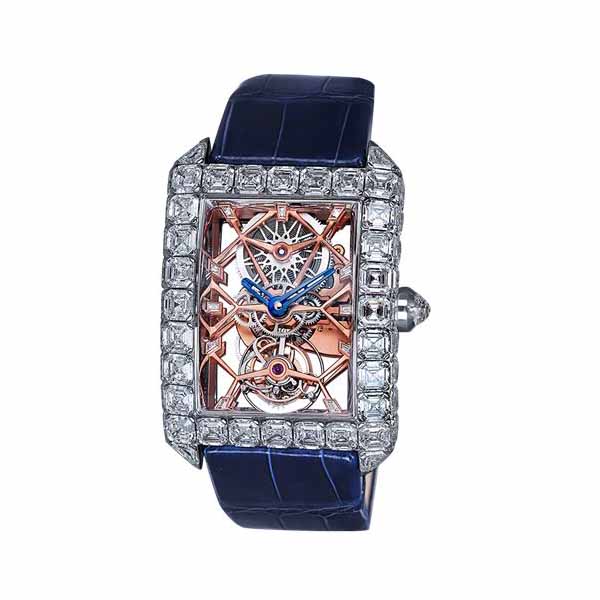46mm x 35mm 18K White Gold case, Case set with 60 Square Emerald Cut Diamonds (17.48 carats), Crown set with 1 Rose-cut Diamond (0.58 carat), 11mm thickness, power reserve 72 h, manual winding movement, scratch resistant sapphire crystal, diamond bezel, water resistant to 30m/165ft.
