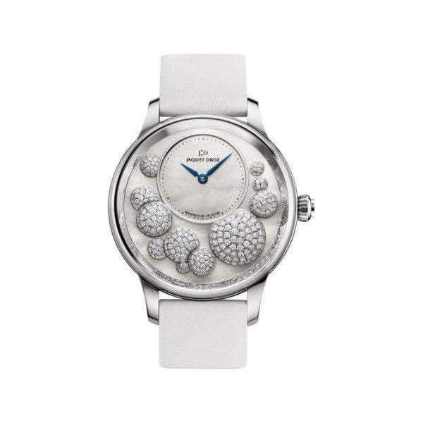 41 mm 18kt white gold case, 13.77 mm thickness, mother of pearl dial, scratch resistant sapphire crystal, transparent case back, white satin strap, tang buckle clasp, automatic movement, water resistant to 30m/100ft.