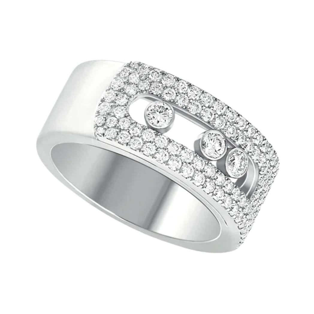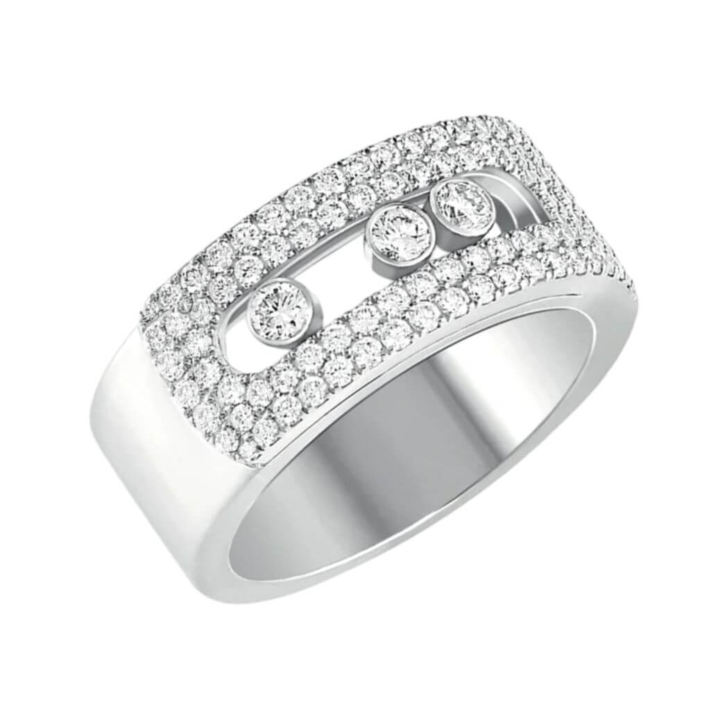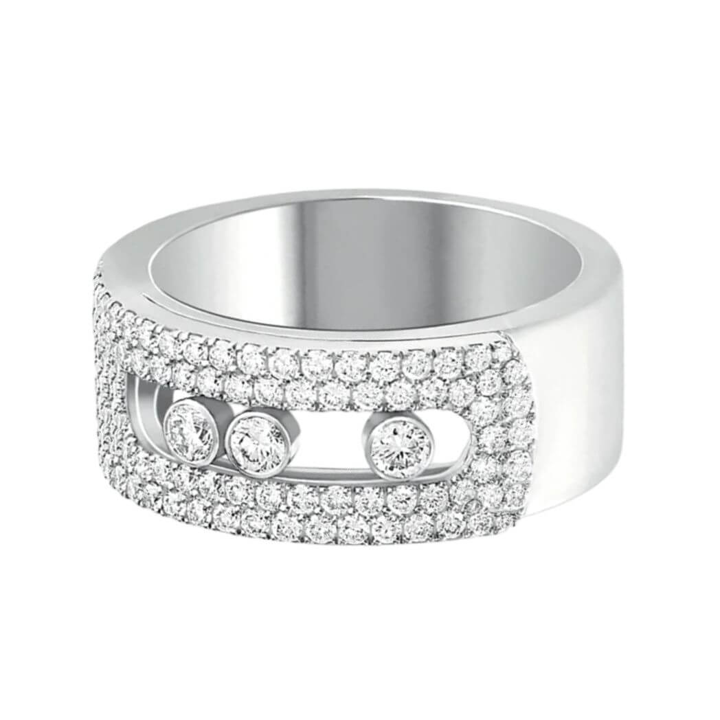 Made from 18ct white gold, this ring stands out as a pinnacle of modern jewelry design. The band showcases a pave setting of round brilliant-cut diamonds, elevating its elegance. The smooth polished bezel settings hold a trio of moving diamonds, adding a touch of grace and dynamism to the piece.