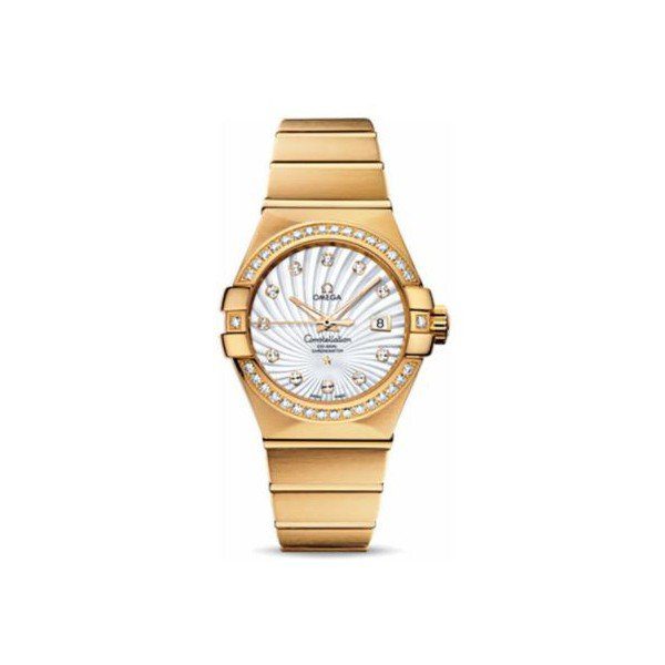 31 mm brushed 18K yellow gold case, transparent back, diamond bezel, domed scratch-resistant sapphire crystal with anti-reflective treatment both sides, white mother-of-pearl shell dial with diamond hour markers, self-winding chronometer Omega 8521 movement with Co-Axial Escapement, date, and seconds, approximately 50 hours of power reserve, 18K yellow gold bracelet. Water resistant to 100 m.