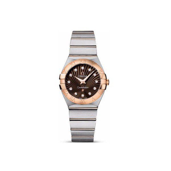 27 mm brushed stainless steel and 18K red gold case, domed scratch-resistant sapphire crystal with anti-reflective treatment inside, brown shell dial with diamond hour markers, quartz Omega 1376 movement, approximately 32 months of power reserve, stainless steel and 18K red gold bracelet. Water resistant to 100 m.