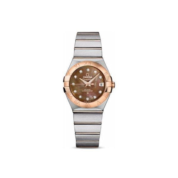 27 mm brushed stainless steel and 18K red gold case, transparent back, domed scratch-resistant sapphire crystal with anti-reflective treatment both sides, fancy mother-of-pearl dial with diamond hour markers, self-winding chronometer Omega 8520 movement with Co-Axial Escapement, date, and seconds, approximately 50 hours of power reserve, stainless steel and 18K red gold bracelet. Water resistant to 100 m.