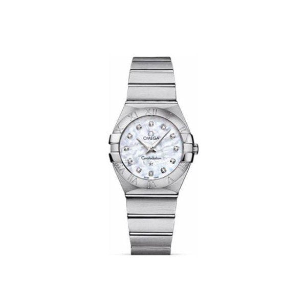 27 mm brushed stainless steel case, domed scratch-resistant sapphire crystal with anti-reflective treatment inside, white mother-of-pearl dial with diamond hour markers, quartz Omega 1376 movement, approximately 32 months of power reserve, stainless steel bracelet. Water resistant to 100 m.