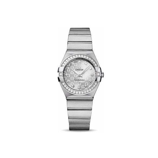 27 mm brushed stainless steel case, diamond bezel, domed scratch-resistant sapphire crystal with anti-reflective treatment inside, silver dial with Omega logo pattern and diamond hour markers, quartz Omega 1376 movement, approximately 32 months of power reserve, stainless steel bracelet. Water resistant to 100 m.