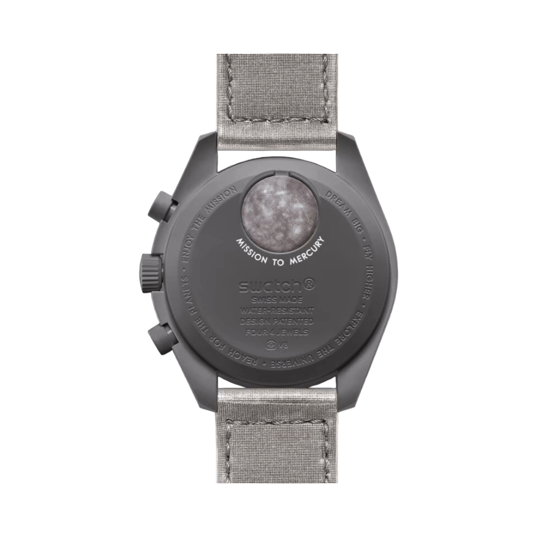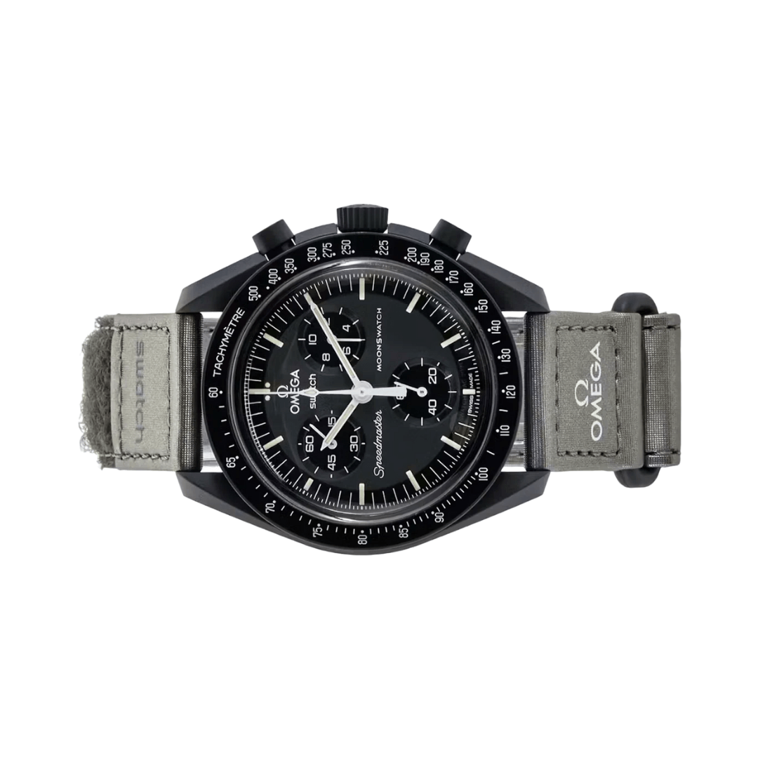 The Omega X Swatch Mission To Mercury boasts an intense deep grey hue with a sleek metallic grey VELCRO© strap. The chronograph seconds hand, subdial hands, and tachymeter scale are in classic white, contrasting beautifully with the sleek black subdials and bezel background. This color scheme exudes a sense of purpose and sophistication, making it a perfect accessory for any occasion.