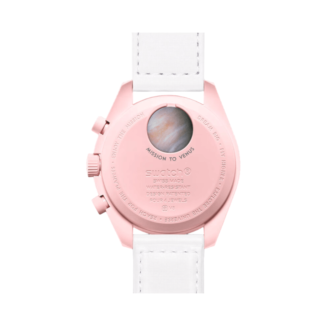 The Mission to Venus watch has pink hour, minute, second, and counter hands, which Swatch describes as having a “touch of feminine elegance.” The diamond-like details on the edges further enhance its stylish appearance, making it a chic accessory for anyone.