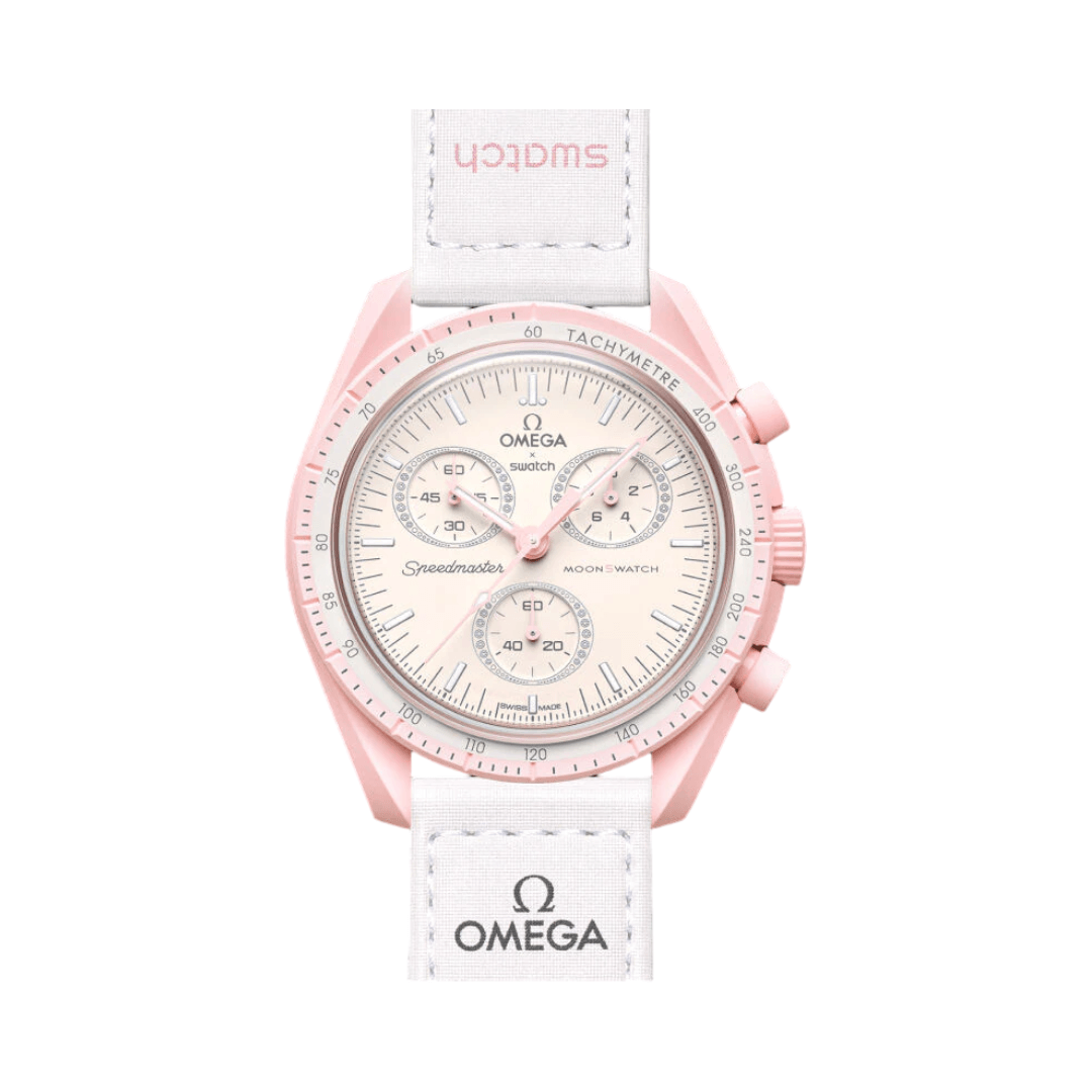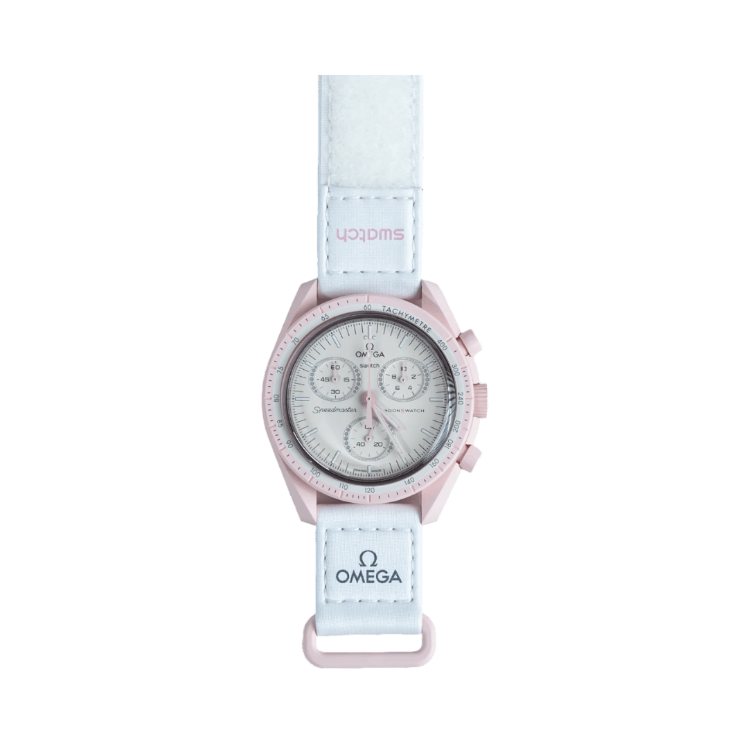 The Omega X Swatch Mission To Venus So33P100 is a stunning timepiece that combines the expertise of Omega and Swatch. This unisex watch showcases beautiful pastel pink hues with beige accents and a white velcro strap, reminiscent of the colors seen on the planet Venus. The pastel design is both sophisticated and eye-catching, making it a perfect accessory for any occasion.