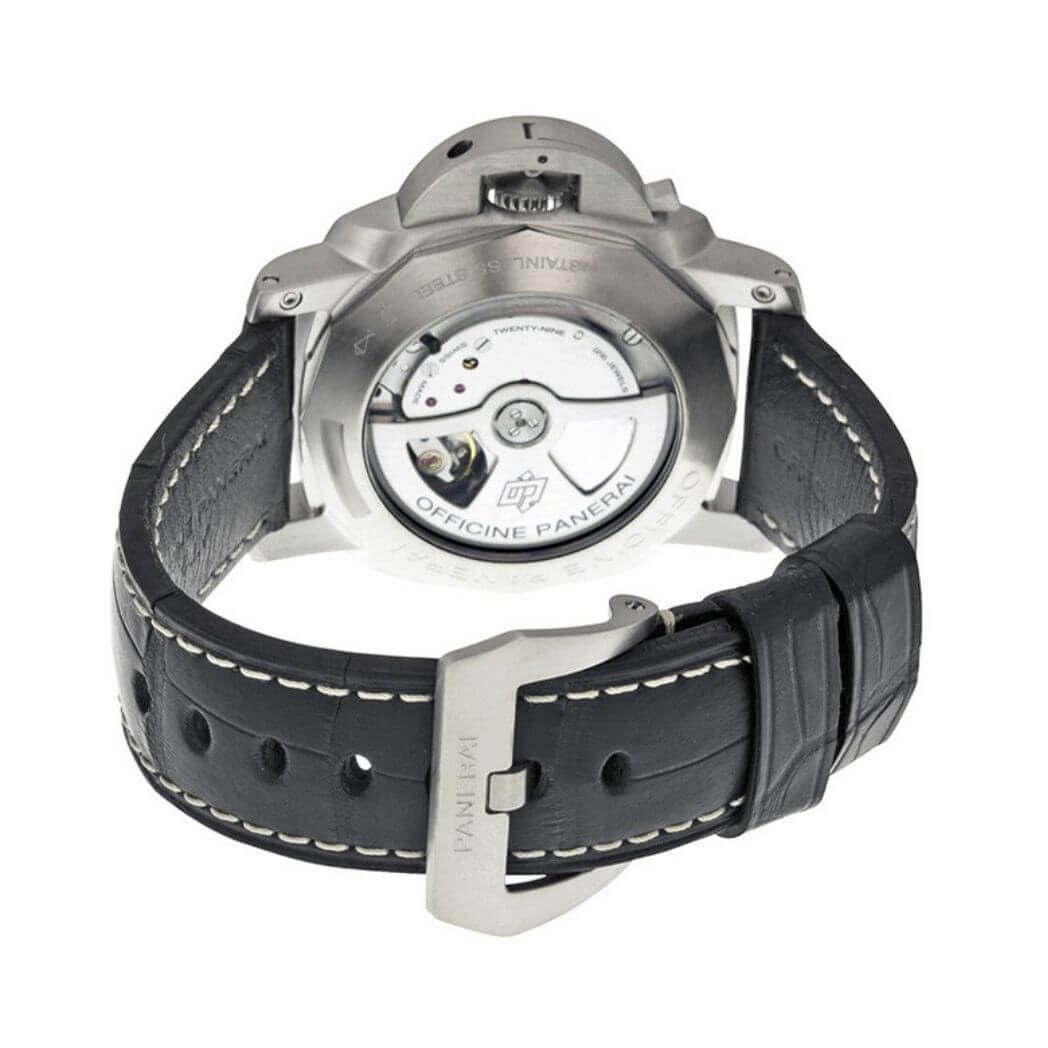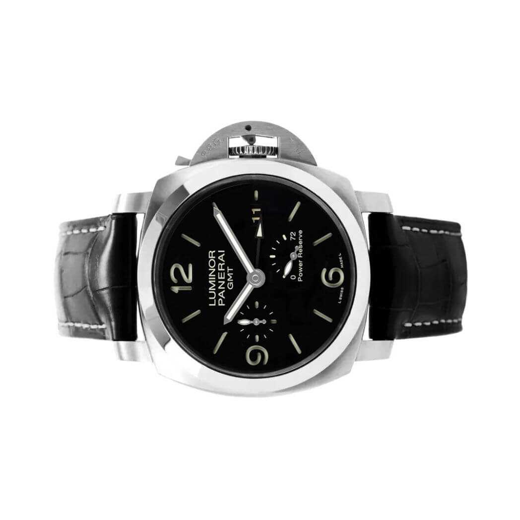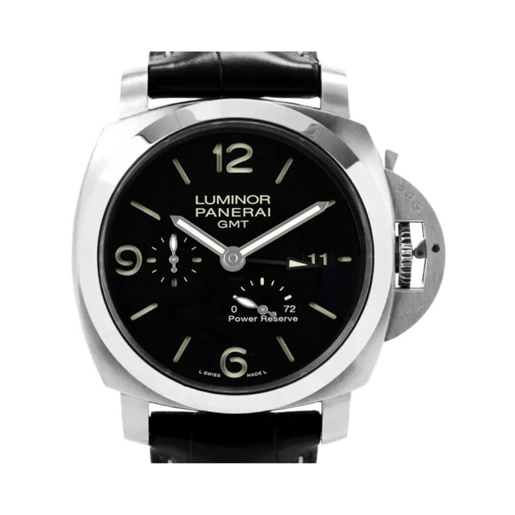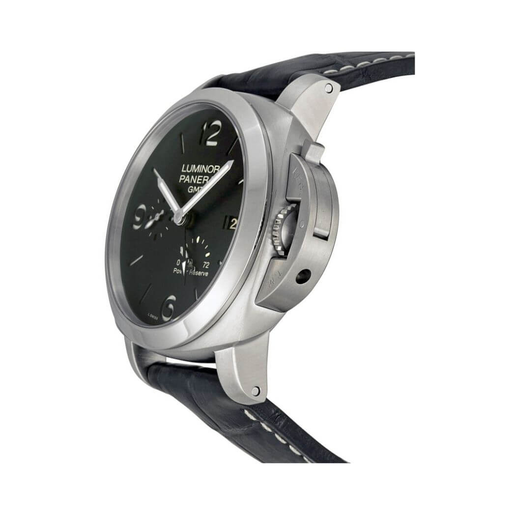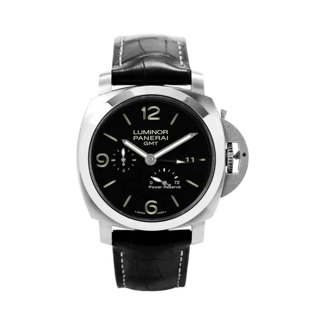 44mm AISI 316L brushed steel case, see-through sapphire crystal back, polished bezel, brushed steel device protecting the crown, black dial with luminous Arabic numerals and hour markers, date at 3 o’clock, seconds at 9 o’clock, power reserve indicator at 5 o’clock, automatic Panerai P.9002 calibre movement with hours, minutes, small seconds, date, second time zone, power reserve indicator, seconds reset, approximately 3 days of power reserve, black leather strap. Water resistant to 300 meters.