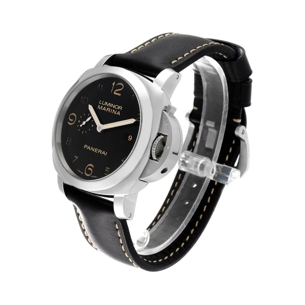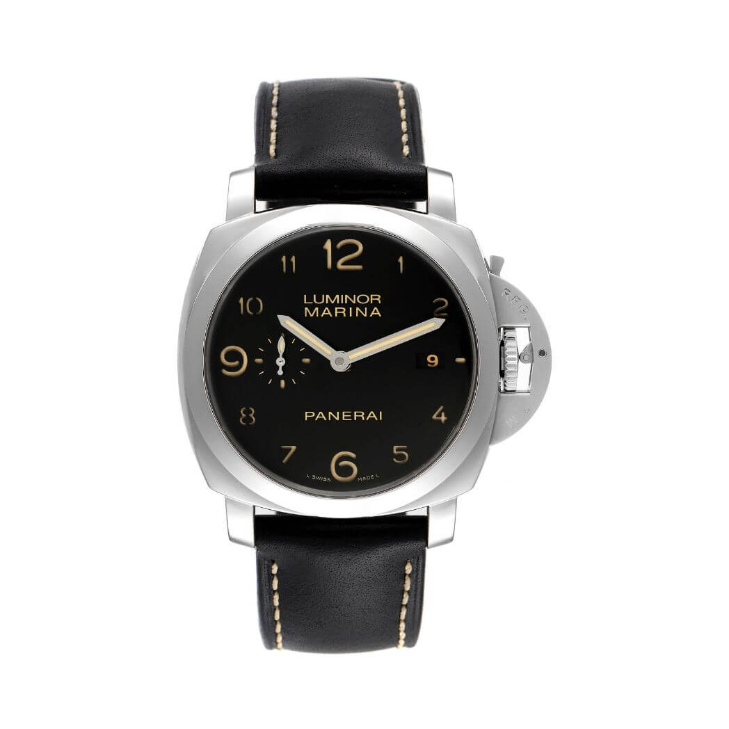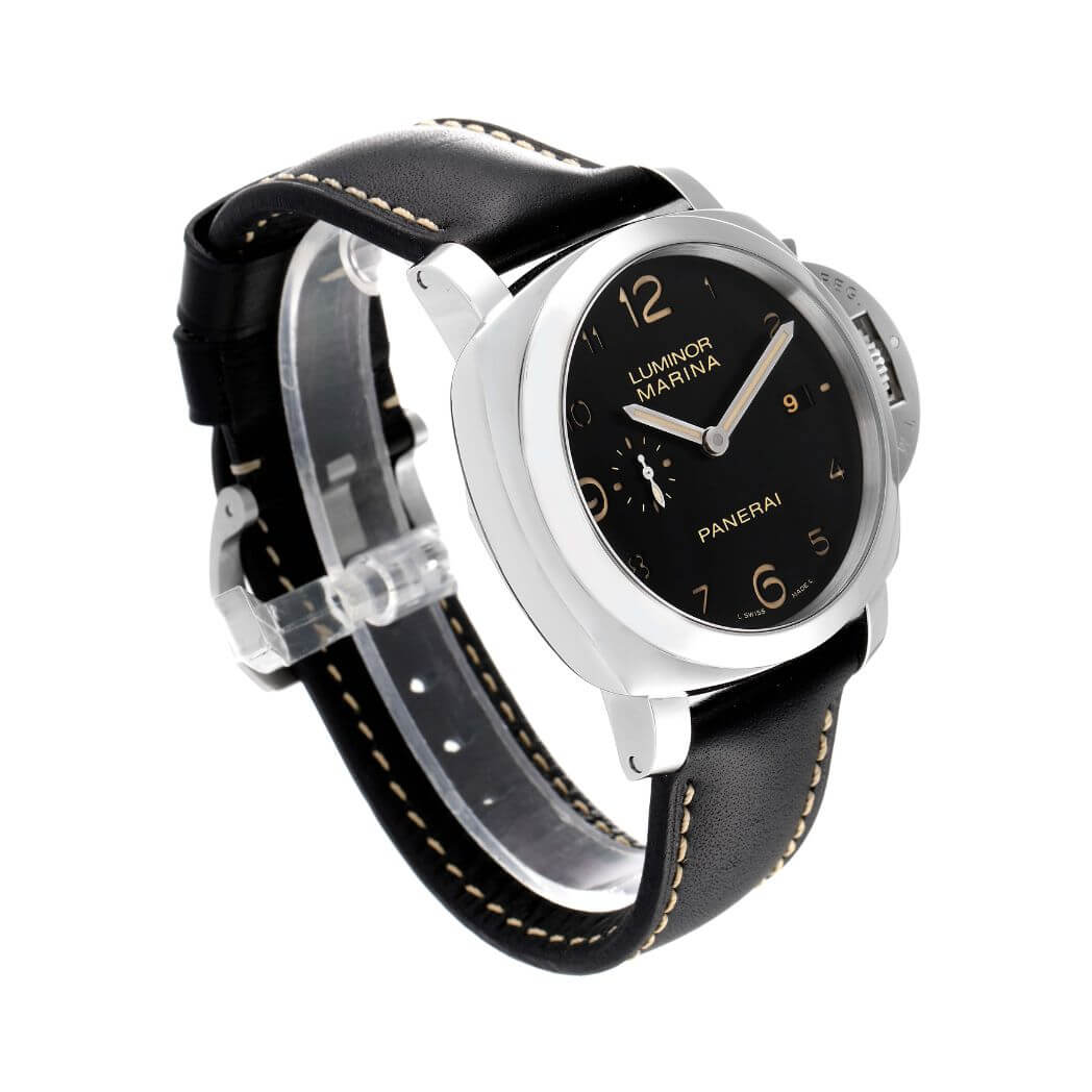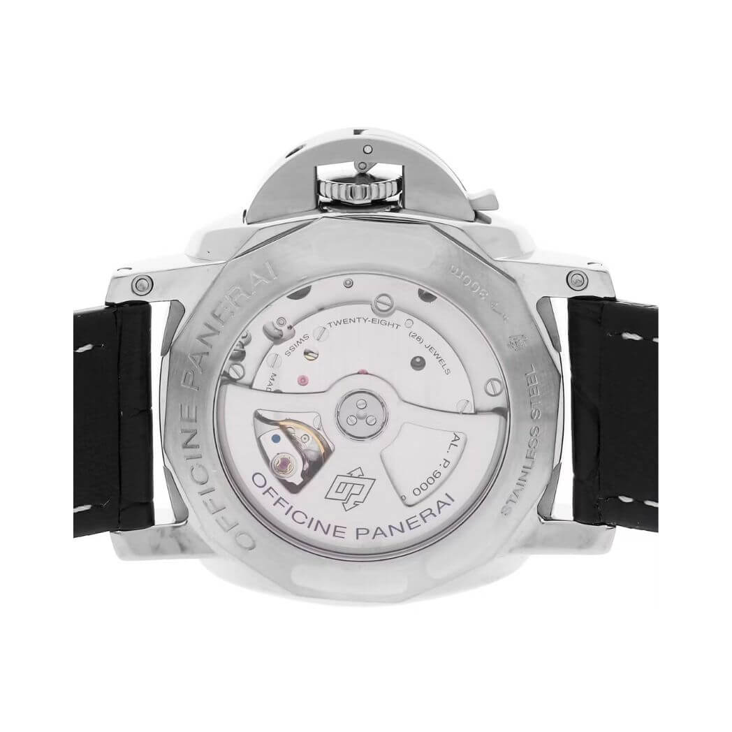 44mm AISI 316L stainless steel case, see-through sapphire crystal back, polished bezel, brushed steel device protecting the crown, black dial with luminous Arabic numerals and hour markers, date at 3 o’clock, seconds at 9 o’clock, automatic Panerai P.9000 calibre movement with hours, minutes, small seconds, date, approximately 3 days of power reserve, black leather strap. Water resistant to 300 meters.