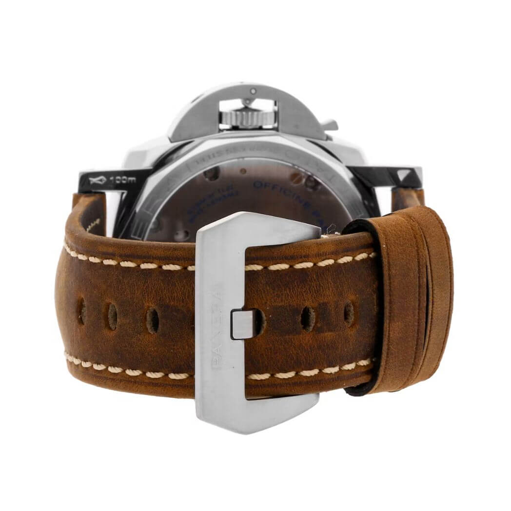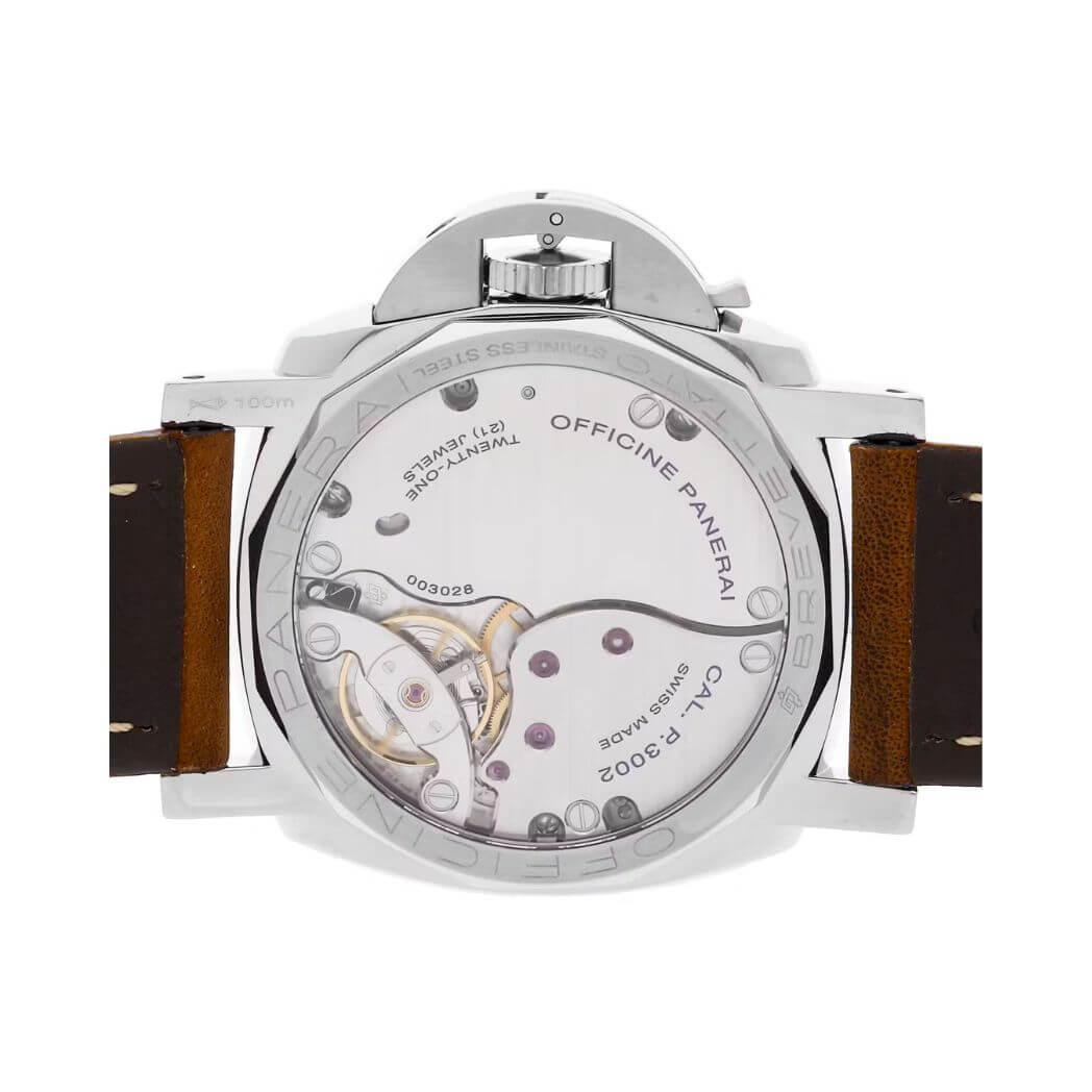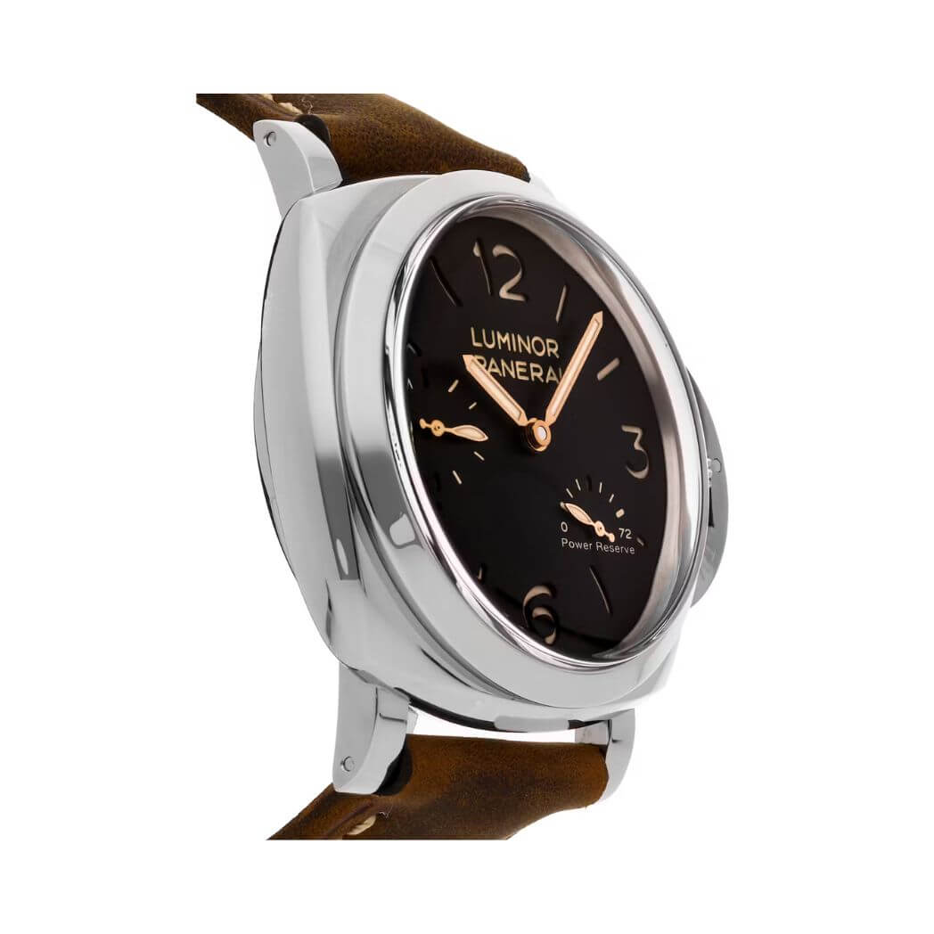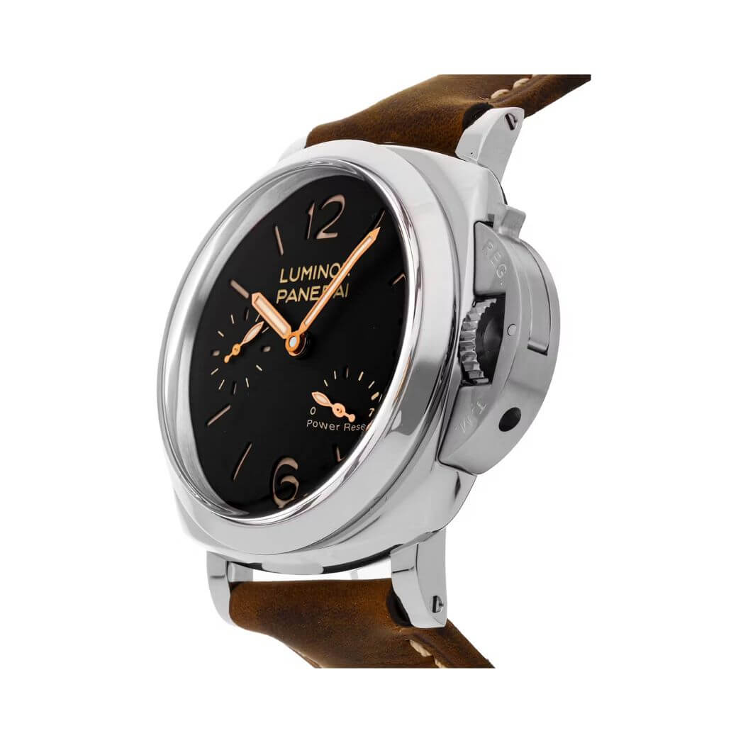 47mm AISI 316L polished steel case, see-through sapphire crystal back, brushed steel device protecting the crown, black dial with luminous Arabic numerals and hour markers, seconds at 9 o’clock, power reserve indicator at 4 o’clock, hand-wound Panerai P.3002 calibre movement with hours, minutes, small seconds, power reserve indicator, seconds reset, approximately 3 days of power reserve, brown leather strap. Water resistant to 100 meters.