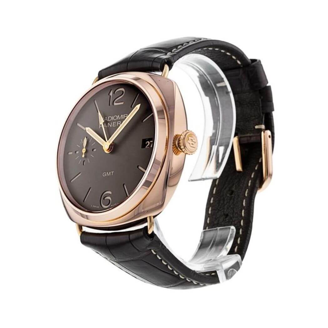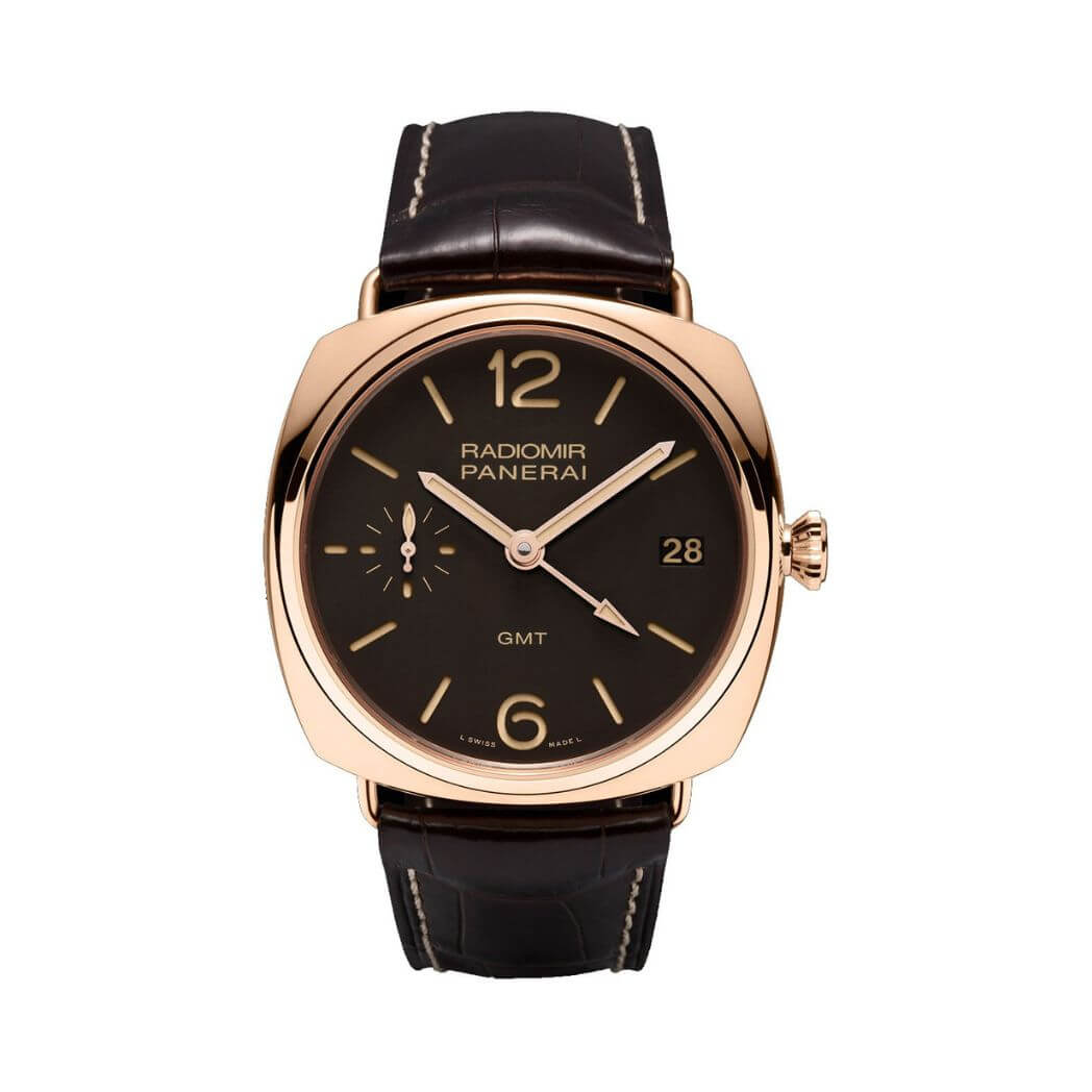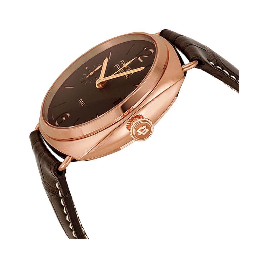 Panerai Historic Radiomir 3 Days GMT Oro Rosso, 47mm 18K polished red gold case with removable wire loop strap attachments, see-through sapphire crystal back, screw-down crown, brown dial with luminous Arabic numerals and hour markers, date at 3 o’clock, seconds at 9 o’clock, hand-wound Panerai P.3001 calibre movement with hours, minutes, small seconds, date, second time zone, power reserve indicator on the back, seconds reset, approximately 3 days of power reserve, brown leather strap. Water resistant to 50 meters.