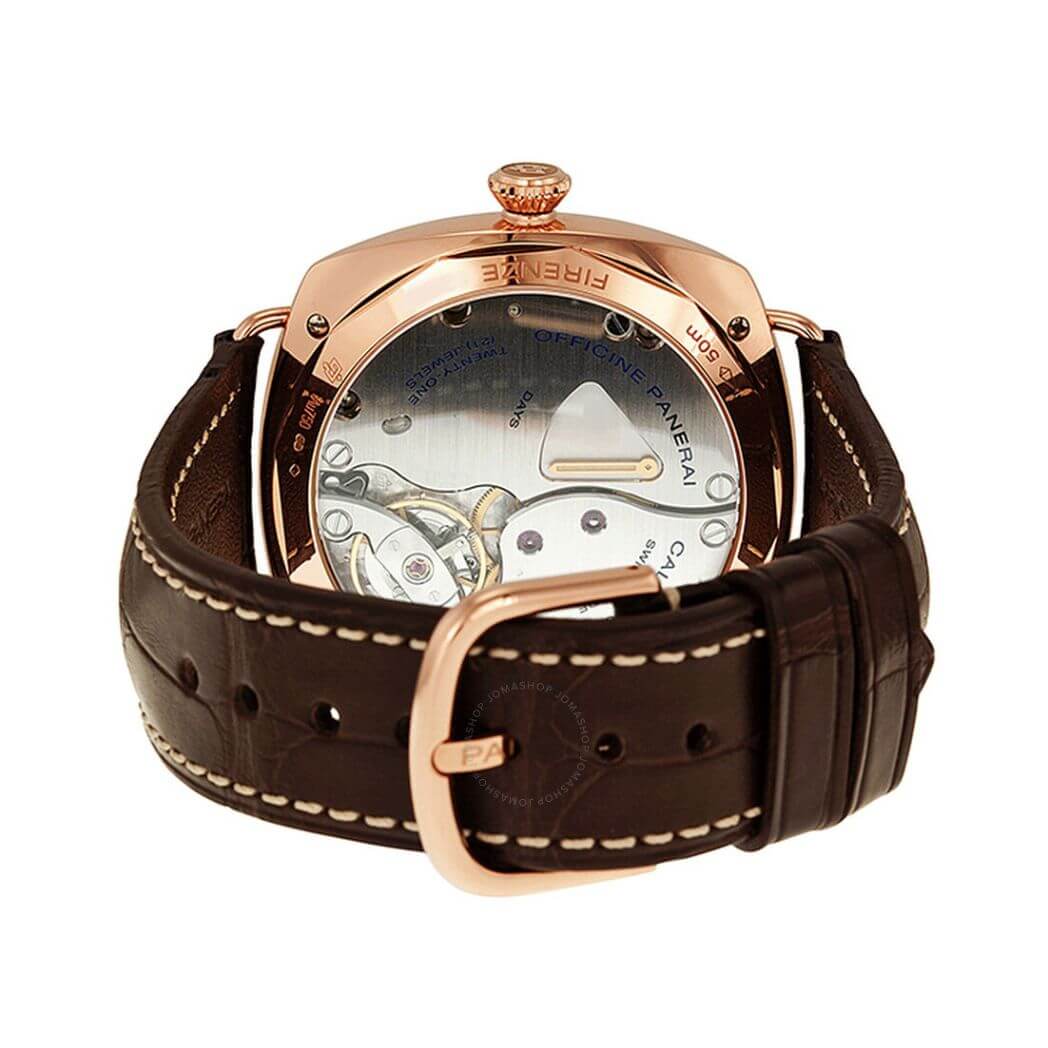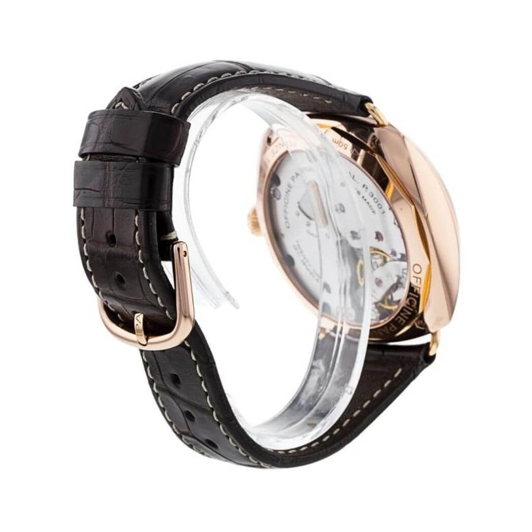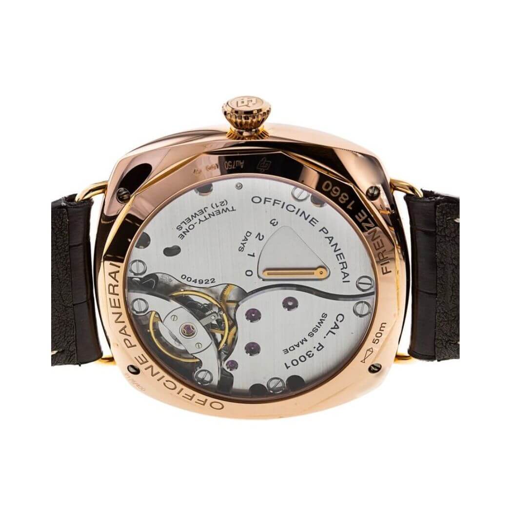 Panerai Historic Radiomir 3 Days GMT Oro Rosso, 47mm 18K polished red gold case with removable wire loop strap attachments, see-through sapphire crystal back, screw-down crown, brown dial with luminous Arabic numerals and hour markers, date at 3 o’clock, seconds at 9 o’clock, hand-wound Panerai P.3001 calibre movement with hours, minutes, small seconds, date, second time zone, power reserve indicator on the back, seconds reset, approximately 3 days of power reserve, brown leather strap. Water resistant to 50 meters.