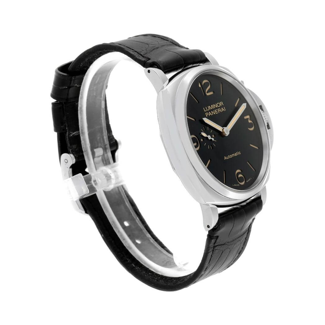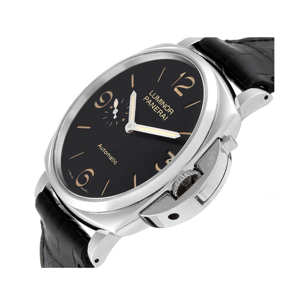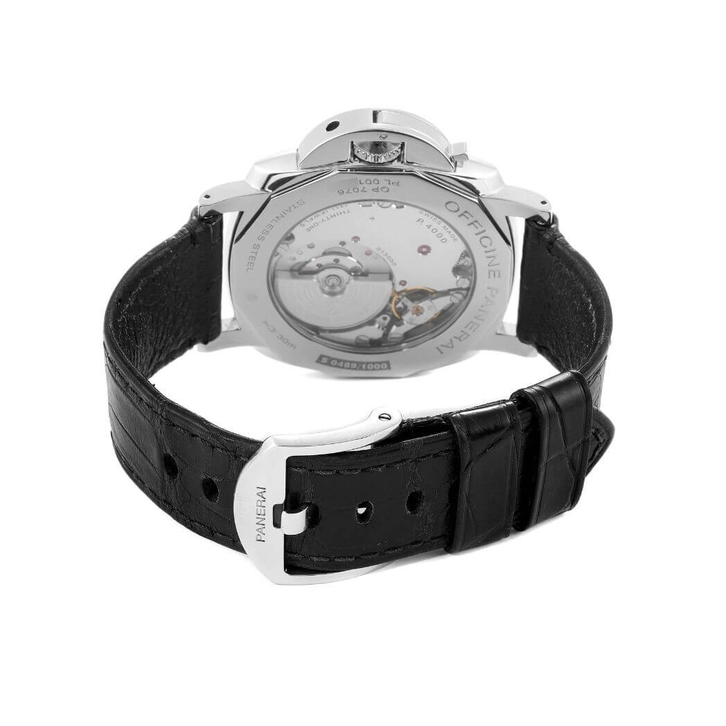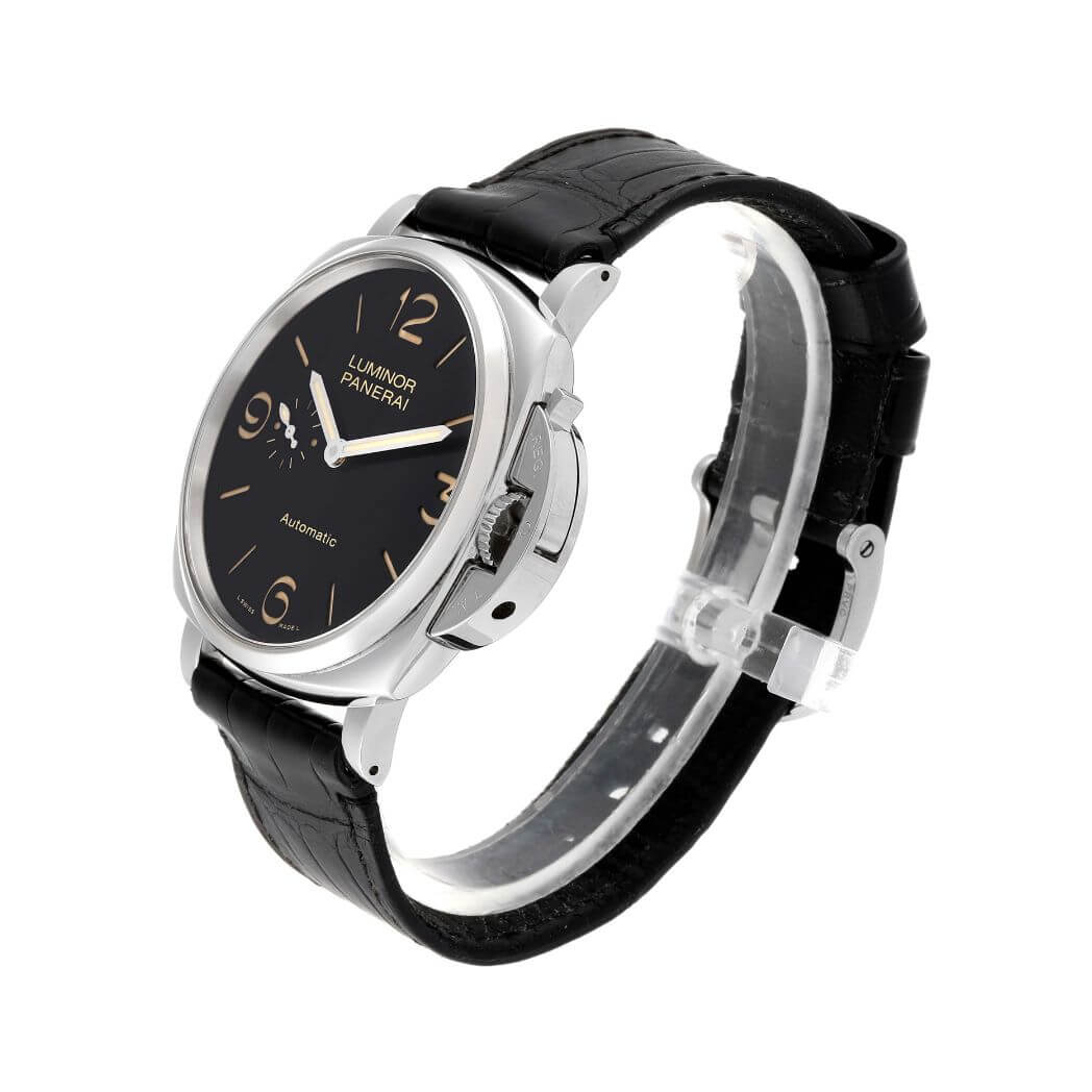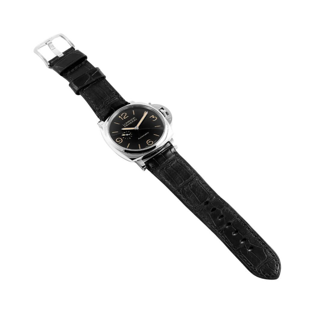 45 mm polished AISI 316 stainless steel case, see-through sapphire crystal back, sapphire? crystal formed of corundum, sun-brushed black dial with luminous Arabic numerals and hour markers and small seconds at 9 o’clock, P.4000 calibre automatic movement with hours, minutes, small seconds, approximately 3 days of power reserve, screw down crown, fixed bezel, buckle clasp, black strap with tone on tone stitching. Water resistant to 30m/100ft.