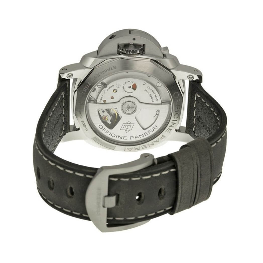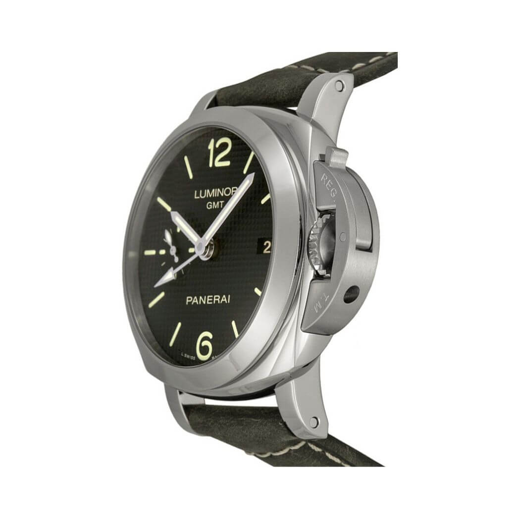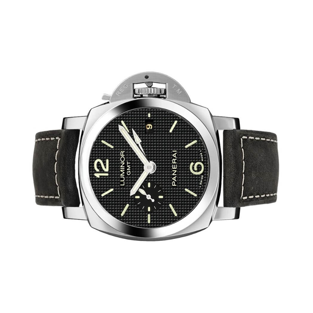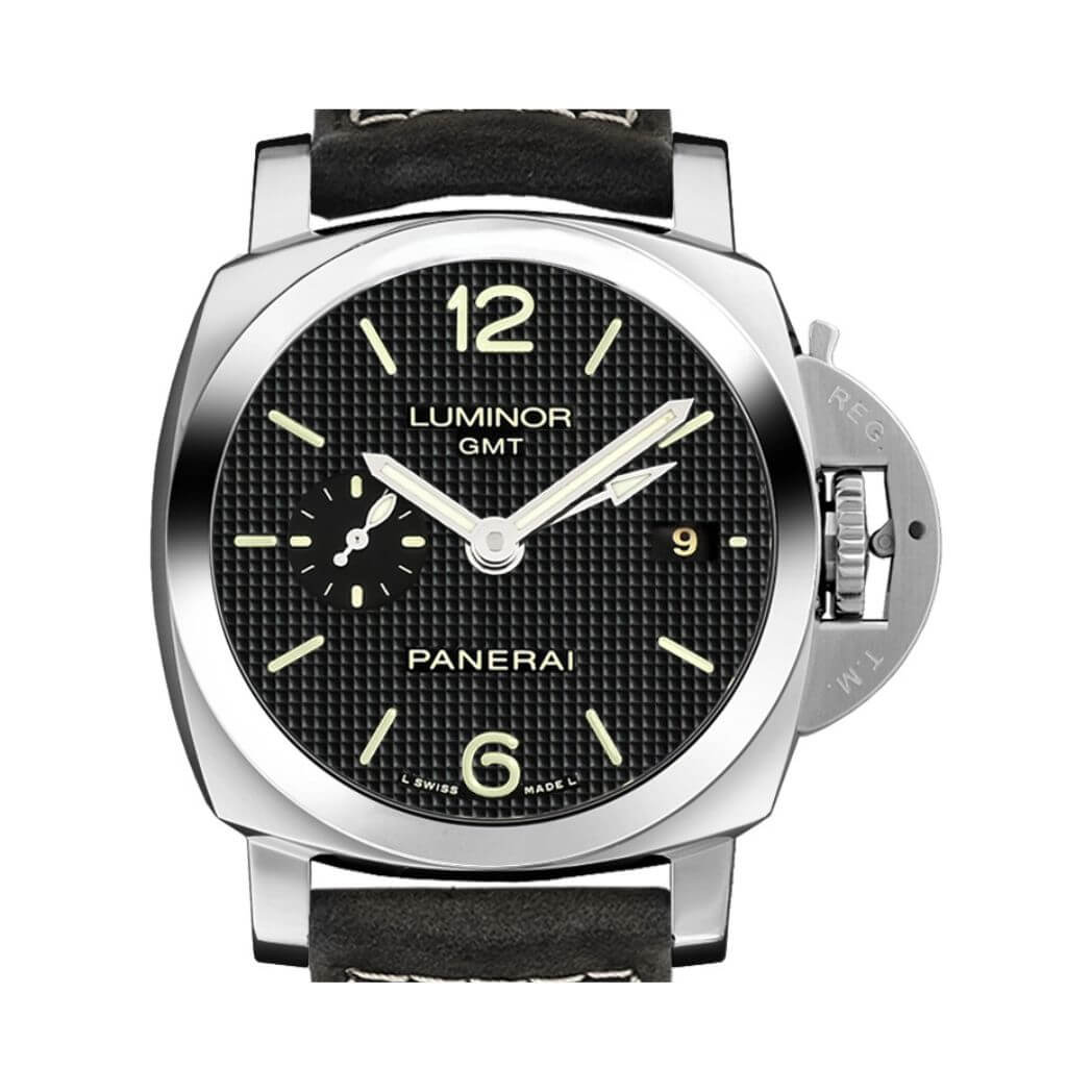 Panerai Luminor 1950 3 Days GMT Automatic Acciaio, 42 mm stainless steel case, black dial, P.9001 calibre automatic movement with hours, minutes, small seconds, date, GMT, power reserve indicator on the back, seconds reset, approximately 3 days of power reserve, black leather strap. Water resistant to 100 meters.