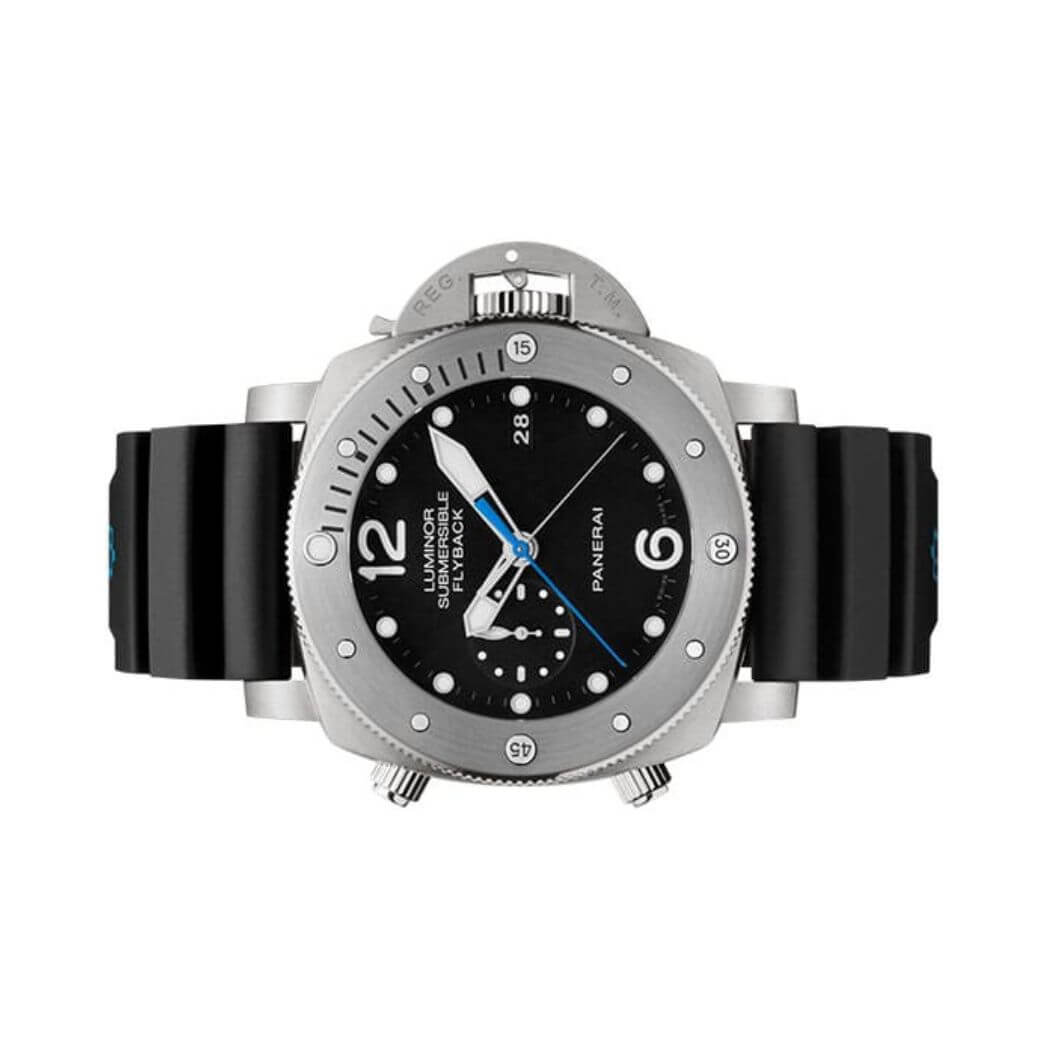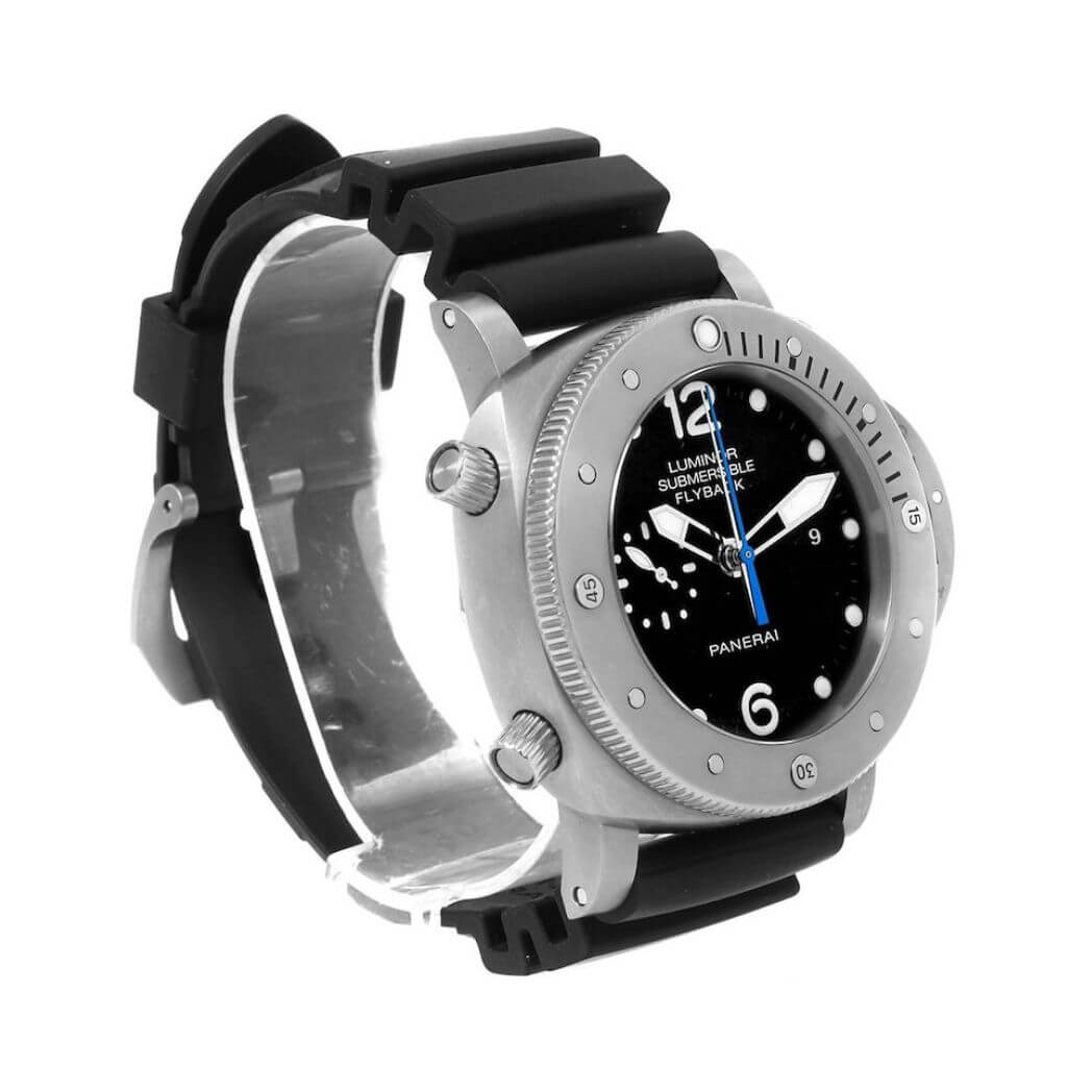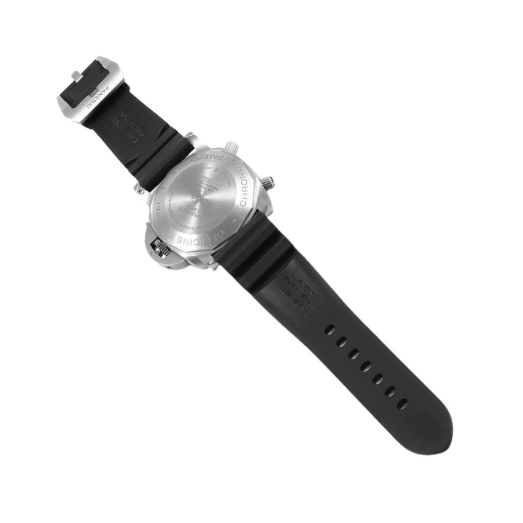 47 mm brushed titanium case, 8.15 mm thick, screw titanium back, brushed titanium crown, brushed titanium bezel with anti-clockwise rotating bezel with graduated scale., sapphire? crystal formed of corundum, black dial with applied luminous arabic numerals and dots, date at 3 o?clock, small seconds at 9 o?clock, central chronograph seconds and minutes hands, automatic movement with hours, minutes, small seconds, date, flyback chronograph, seconds reset, calculation of immersion time, approximately 3 days of power reserve, black caoutchouc strap. Water resistant to 30m/100ft.