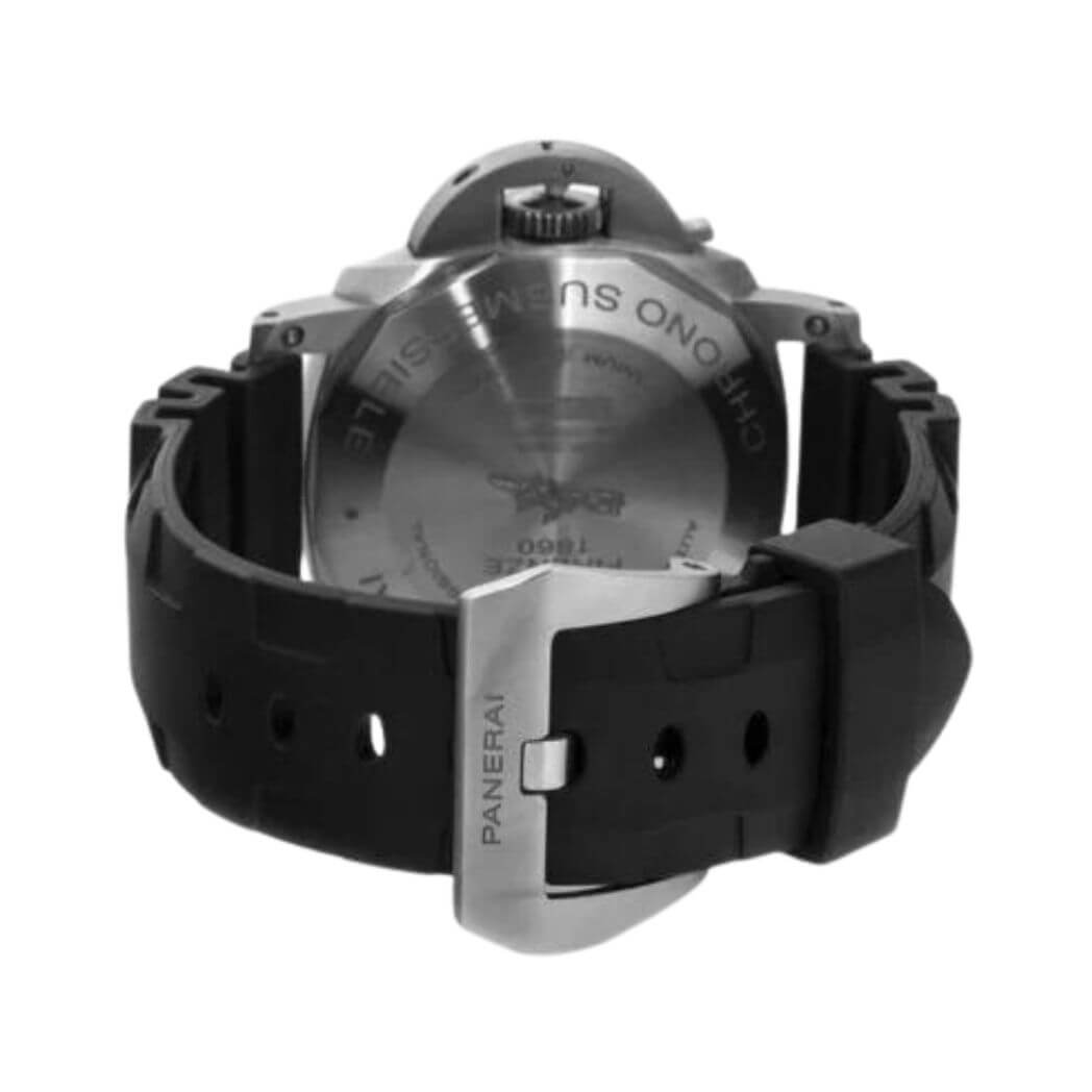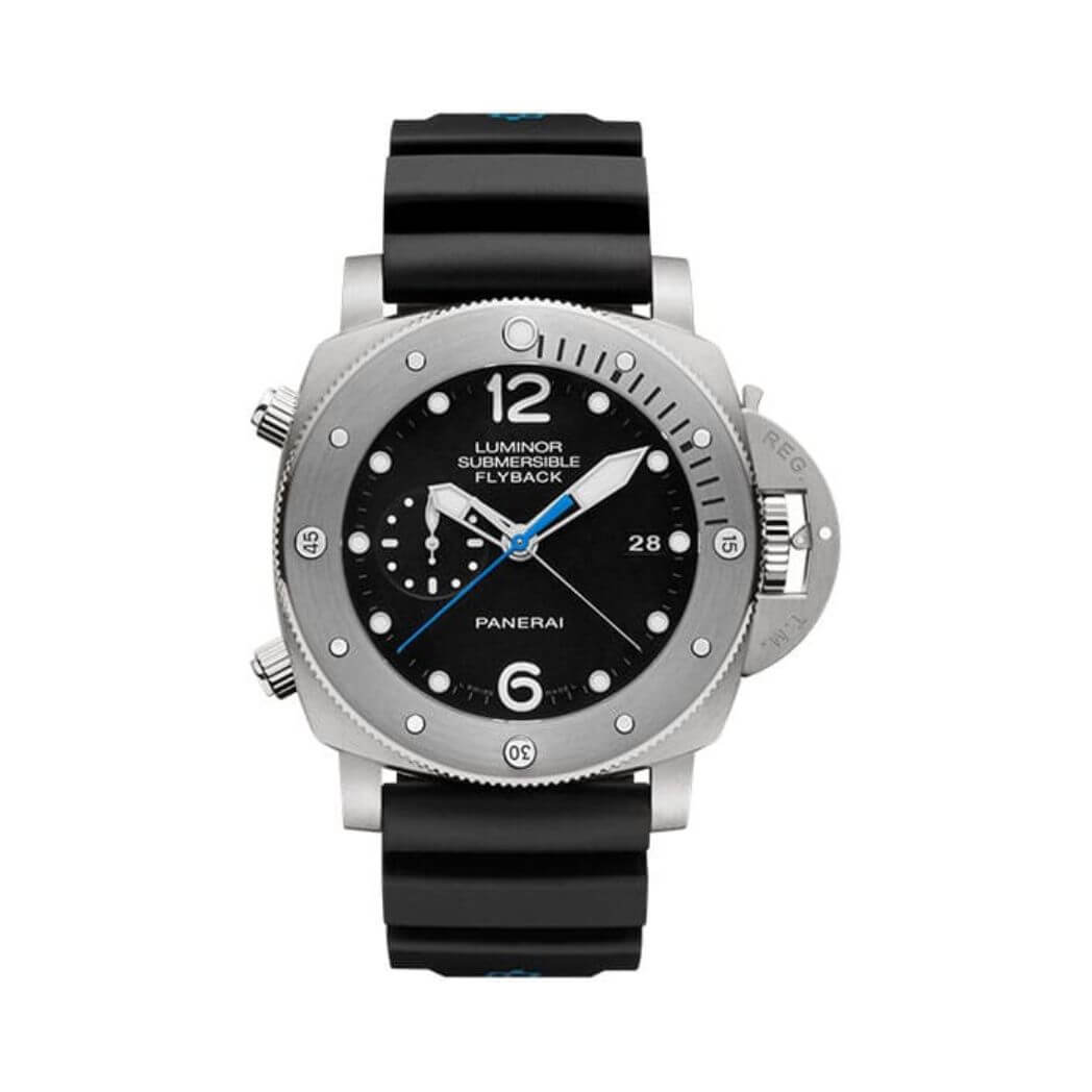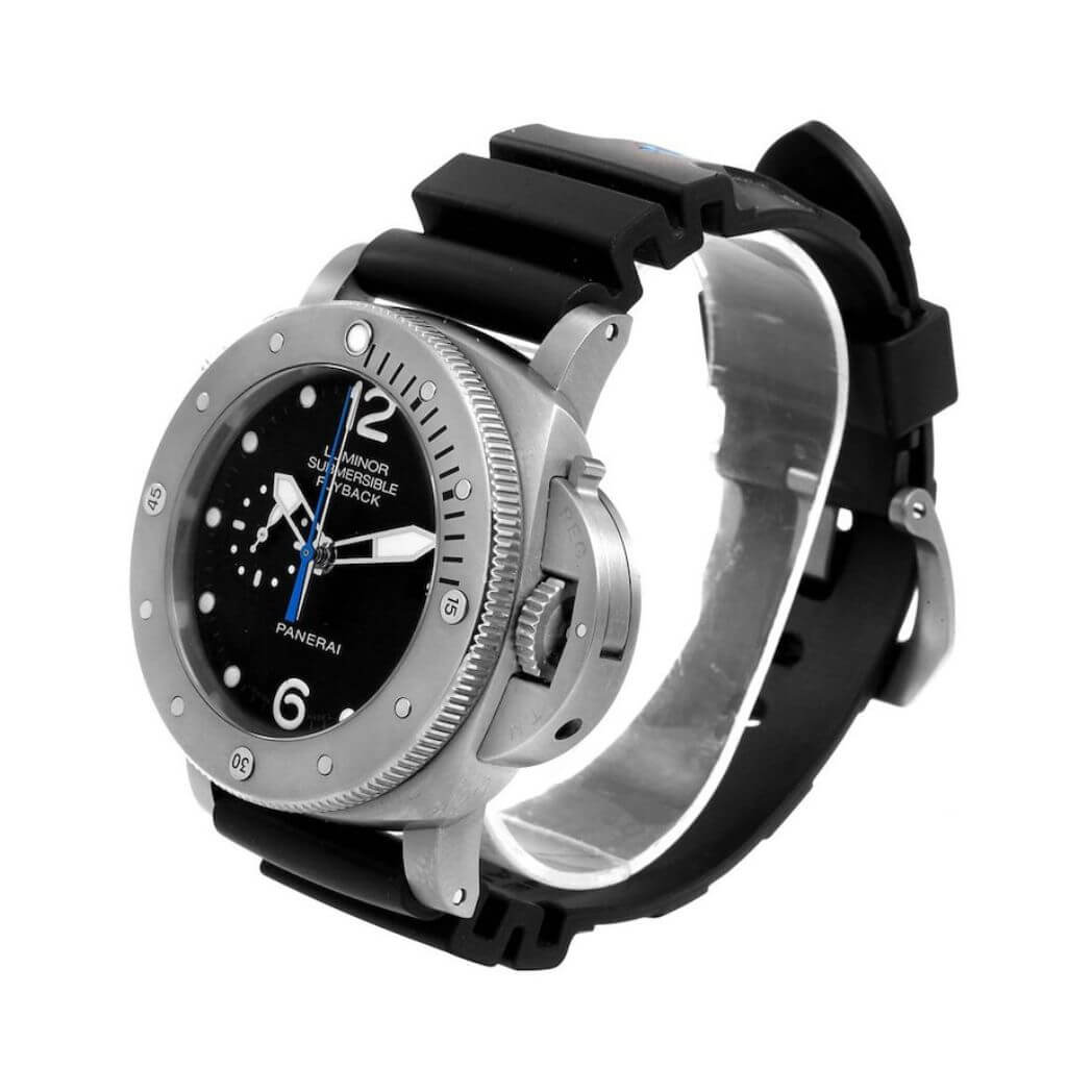 47 mm brushed titanium case, 8.15 mm thick, screw titanium back, brushed titanium crown, brushed titanium bezel with anti-clockwise rotating bezel with graduated scale., sapphire? crystal formed of corundum, black dial with applied luminous arabic numerals and dots, date at 3 o?clock, small seconds at 9 o?clock, central chronograph seconds and minutes hands, automatic movement with hours, minutes, small seconds, date, flyback chronograph, seconds reset, calculation of immersion time, approximately 3 days of power reserve, black caoutchouc strap. Water resistant to 30m/100ft.